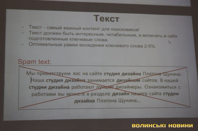 Основний акцент, зі слів лектора, робити треба на контенті сайту – а це текст, фото, відео, аудіо. Не можна втрачати свого читача. Бо зараз боти вийшли на такий рівень, що вони відстежують, скільки часу провів юзер на ресурсі, «бачать», чи дочитав він статтю до кінця. І якщо один покинув її на півсторінки, потім – інший, і так далі – то пошуковики понижують сам рейтинг ресурсу.
