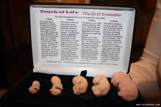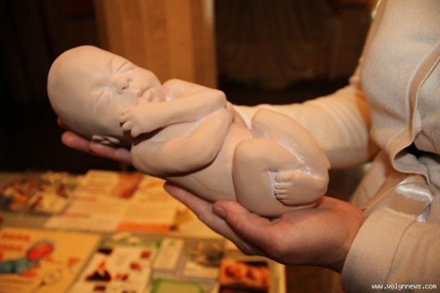 Вона розповіла, що під час зустрічей та лекцій у навчальних закладах міста вони використовують силіконові моделі малят від 4 тижнів внутрішньоутробного розвитку і до 7-ми місячного віку, аби ілюструвати наочно, що дитинка, яка втратила можливість народитися за рішенням мами – не «біологічні відходи».