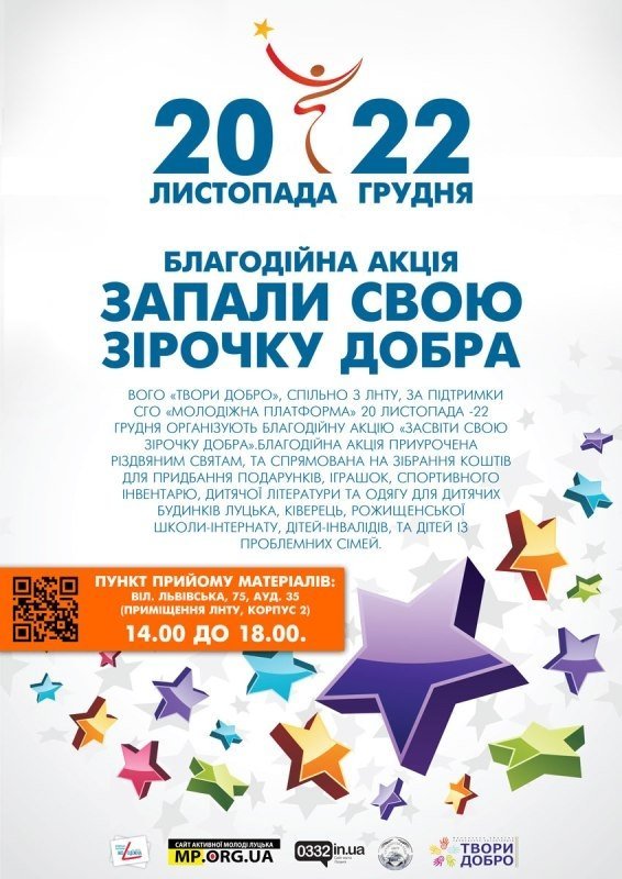 Благодійна акція «Засвіти свою зірочку добра» триватиме з 20 листопада по 22 грудня у Луцьку. За гроші, зібрані під час заходу, вихованцям волинських дитбудинків, придбають подарунки до різдвяних свят.