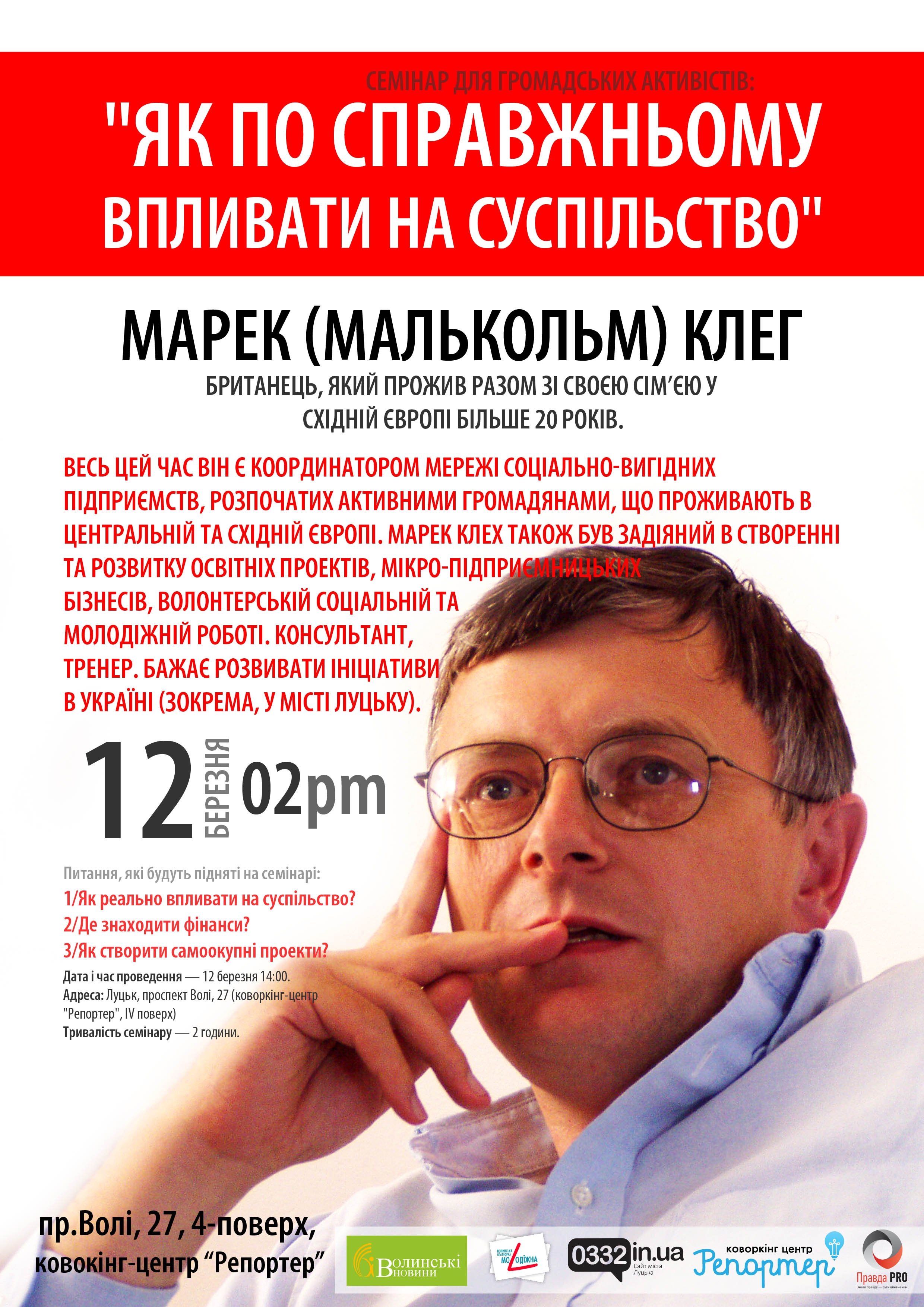 Зокрема семінар «Як по справжньому впливати на суспільство?» проведе британець Марек (Малькольм) Клег завтра, 12-ого березня, о 14:00 за адресою проспект Волі, 27 (коворкінг-центр «Репортер», IV поверх).