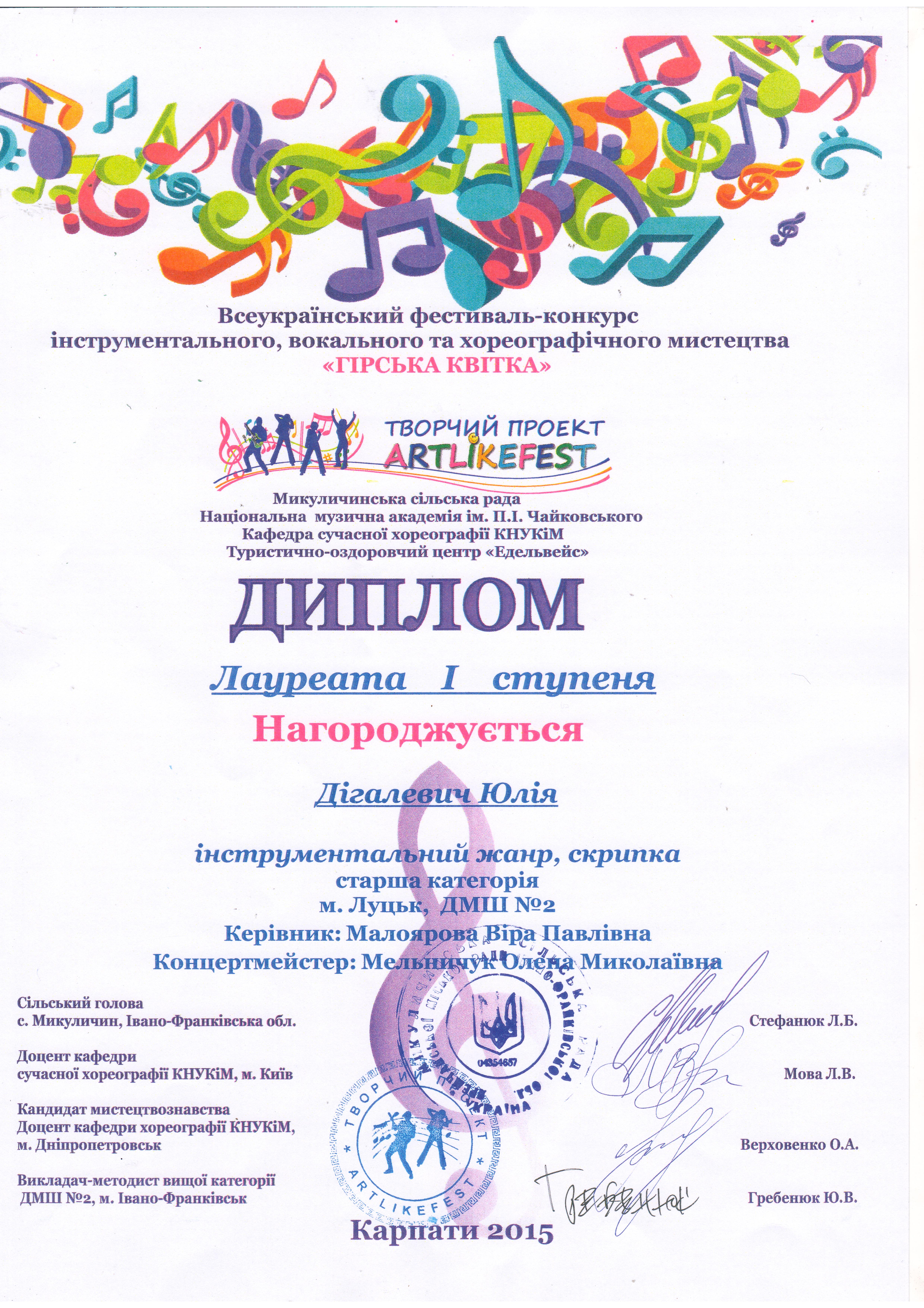 Лауреатом першого ступеня в інструментальному жанрі по класу скрипки стала лучанка Юлія Дігалевич, яка зіграла разом зі своїм концертмейстером Оленою Мельничук. Про це повідомляють у прес-службі Фонду Ігоря Палиці «Новий Луцьк».