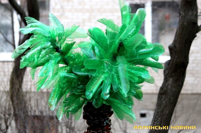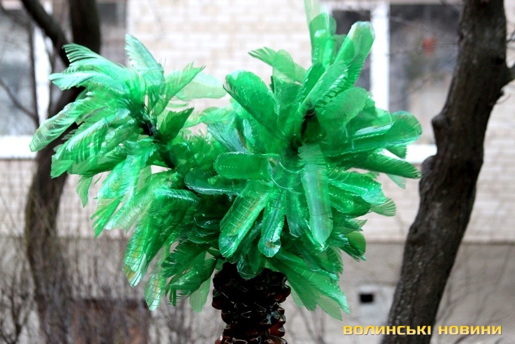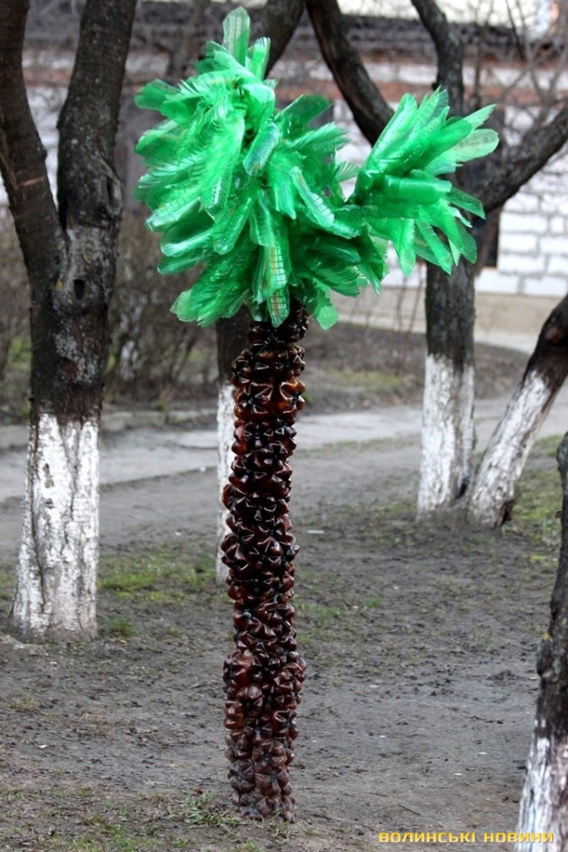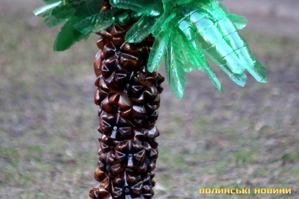 Стовбур пальми зробили з дна коричневих пляшок, а листя із зелених пляшок. «Гавайські пальми» встановили на дитячому майданчику. Їхня висота різна: від півметра до двох метрів. Окрім цього, із пластикових пляшок, але вже жовтого кольору, зробили бджілок. Чорні полоси для комах нанесли, використовуючи ізоляційну стрічку.