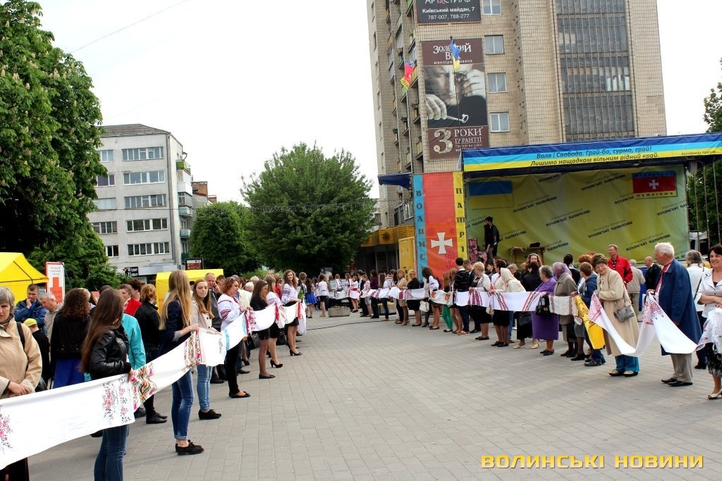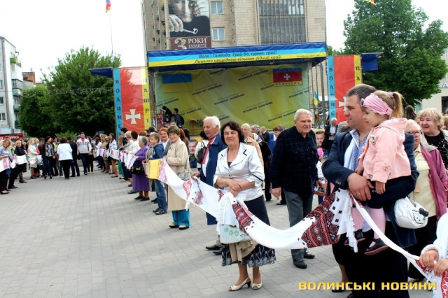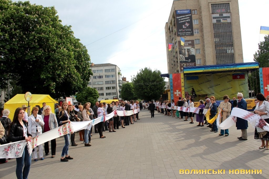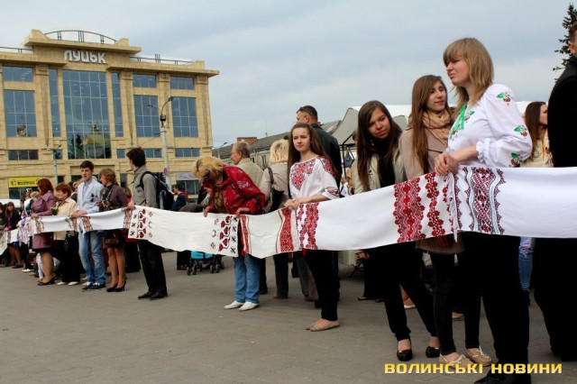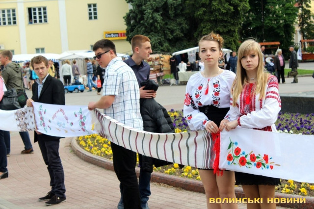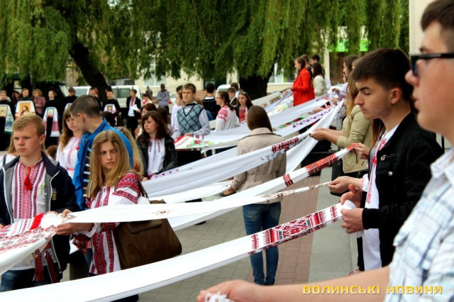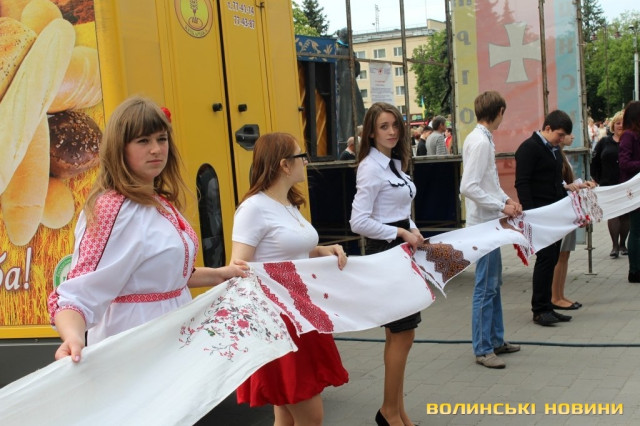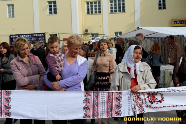 Напис «Єдина Україна» та рушник єднання утворили під час фестивалю «Вишиті обереги єднання» у Луцьку.