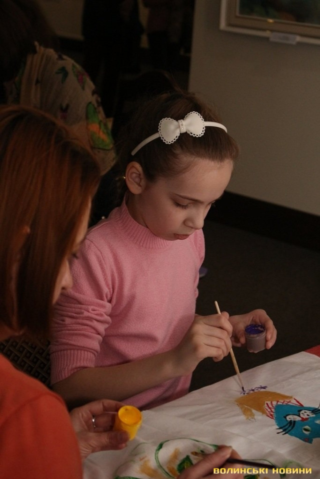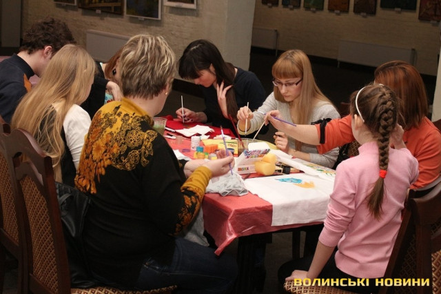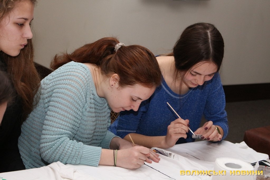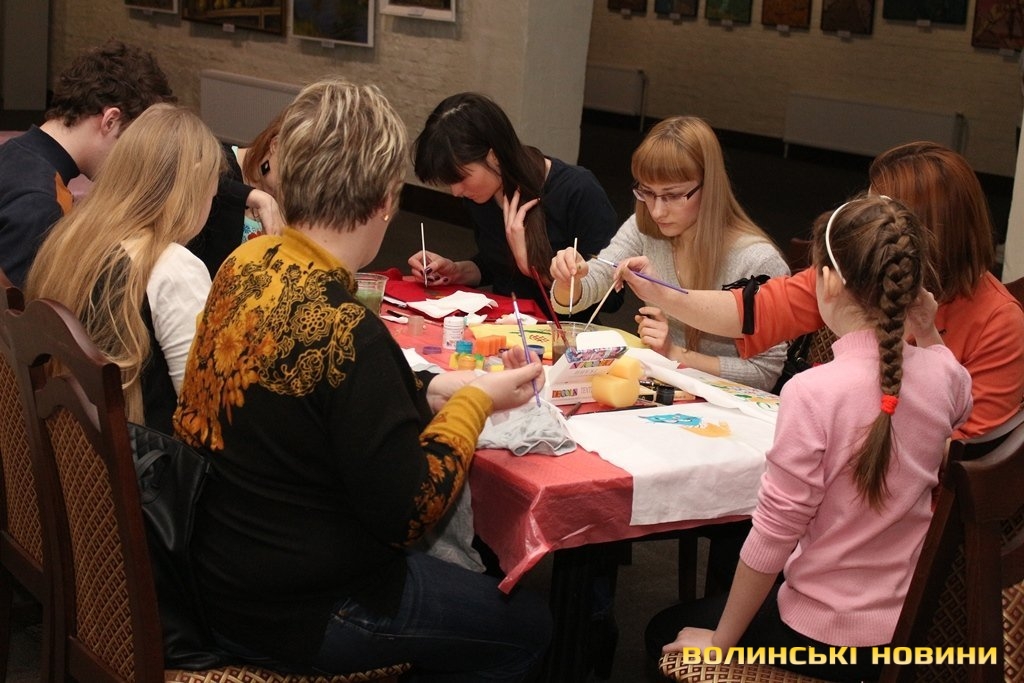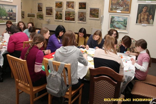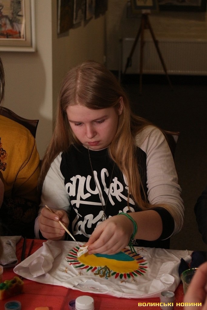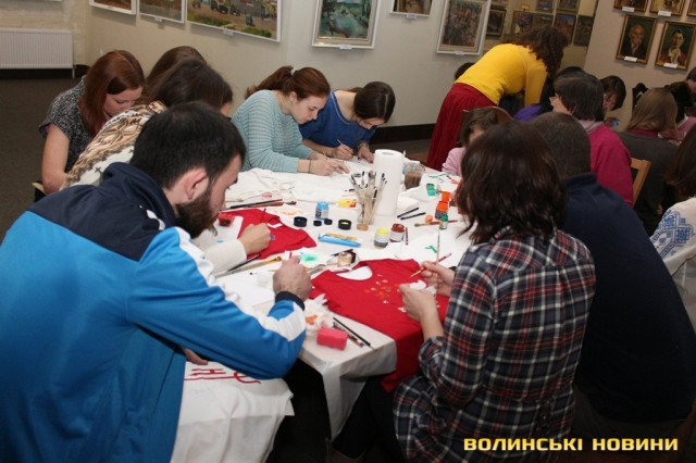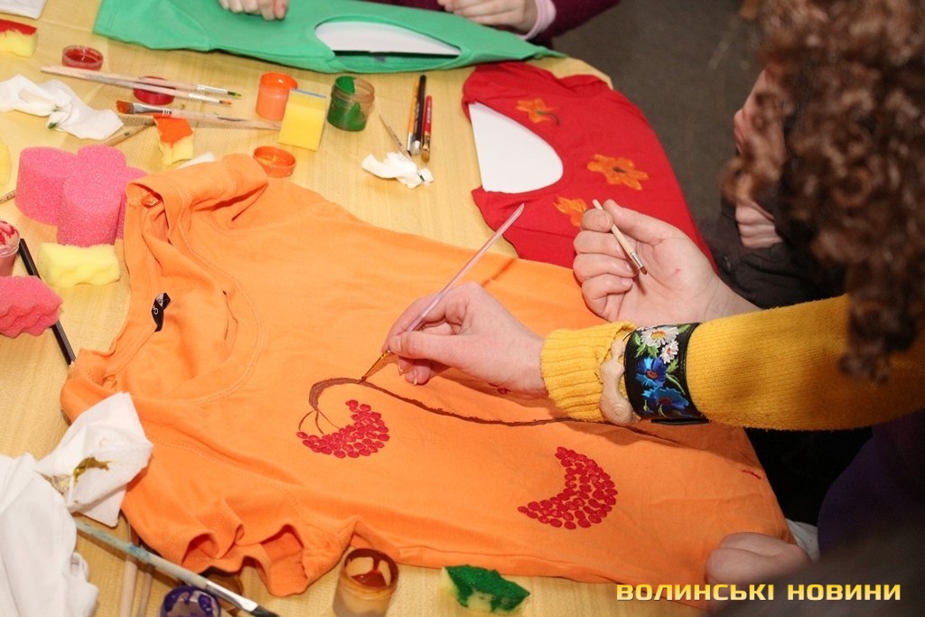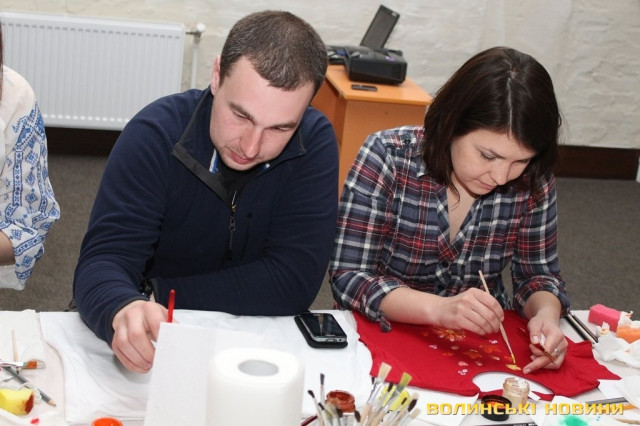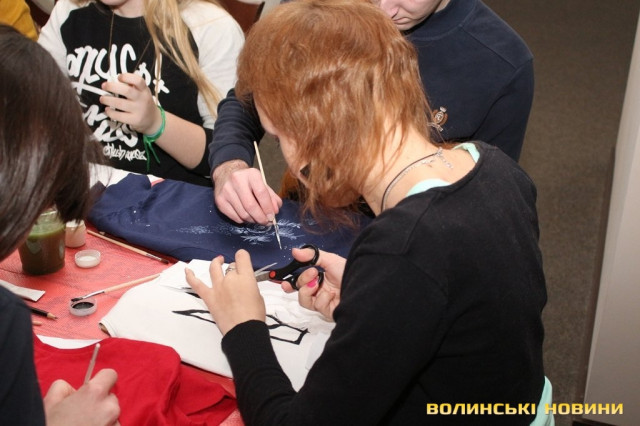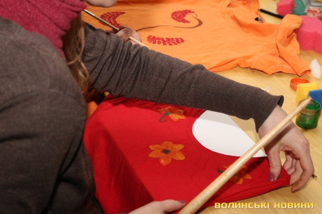 Узявши до рук пензлі й фарби, люди різних вікових категорій вправлялися в художній майстерності, пробуючи власний хист на тканині і тим самим вдихаючи життя у неповторну, якісну та модну річ.Тканину розписують спеціальними акриловими фарбами, через добу після висихання малюнка виріб треба попрасувати. Фарби схожі на гуашеві, але завдяки властивостям тканини, яка має свій хай і невеличкий, але все ж рельєф, процес малювання відрізняється від письма на папері чи полотні. Розписувати можна з попереднім малюнком або без нього. Використання розчинника для акрилових фарб (це не ацетон і він не пахне) дає можливість створити ефект прозорості, також ним можна витерти невдалий малюнок.«Такі вироби можна спокійно прати. Зараз дуже популярні українські мотиви. Я вважаю, що учасники майстер-класу – це не просто люди, які захотіли прийти і розважитися лише через якісь там віяння моди. Це - люди, яким справді подобається і вони хочуть мати цікаву річ, зроблені власними руками», - розповідає Марійка, і додає, що спеціальні фарби можна придбати у мистецькій крамниці та майже у будь-якому художньому магазині.Спробувати власні сили мали можливість й ті, хто раніше не тримав у руках пензля, адже у розписі одягу використовували й елементи, створені методом штампування - вибійки.