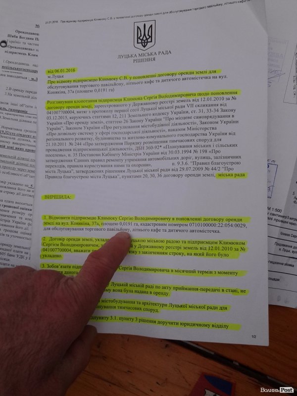 Термін оренди збіг, тож депутати Луцької міськради взялися обстежувати ділянку та з’ясовувати, чи продовжувати підприємцю договір оренди, чи ні. 20-го січня під час засідання постійної комісії міської ради з питань земельних відносин і земельного кадастру депутати вирішили договір оренди не продовжувати.«Договір оренди ми не можемо продовжити, тому що там немає майна. Цьому підприємцю надали для встановлення тимчасової споруди 3,5 кв.м. Він самовільно добудував те, що захотів. Крім того, коли ми приїжджали перший раз, він змурував стіну, але каже, що забере її, це просто так. Ми виїжджали ще по одній справі кілька днів тому, то він вхід поставив і вікна. Це вже капітальне будівництво», - каже депутат Луцької міської ради Євгеній Ткачук.