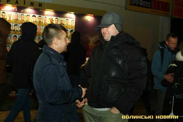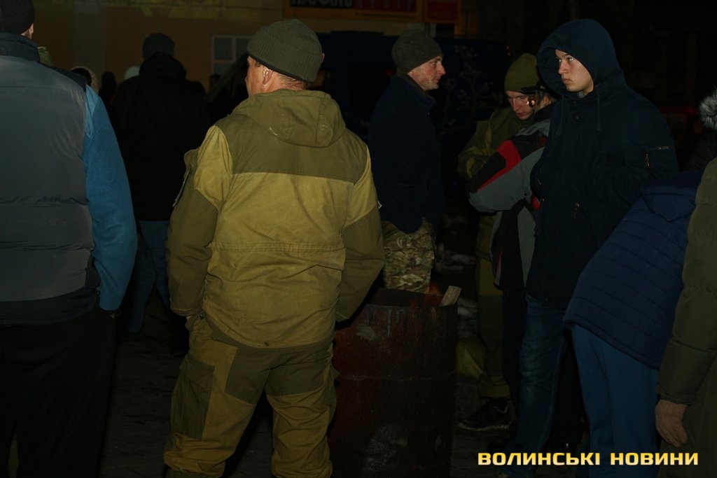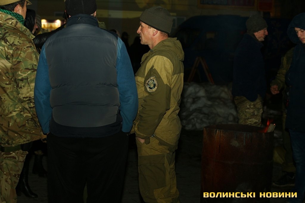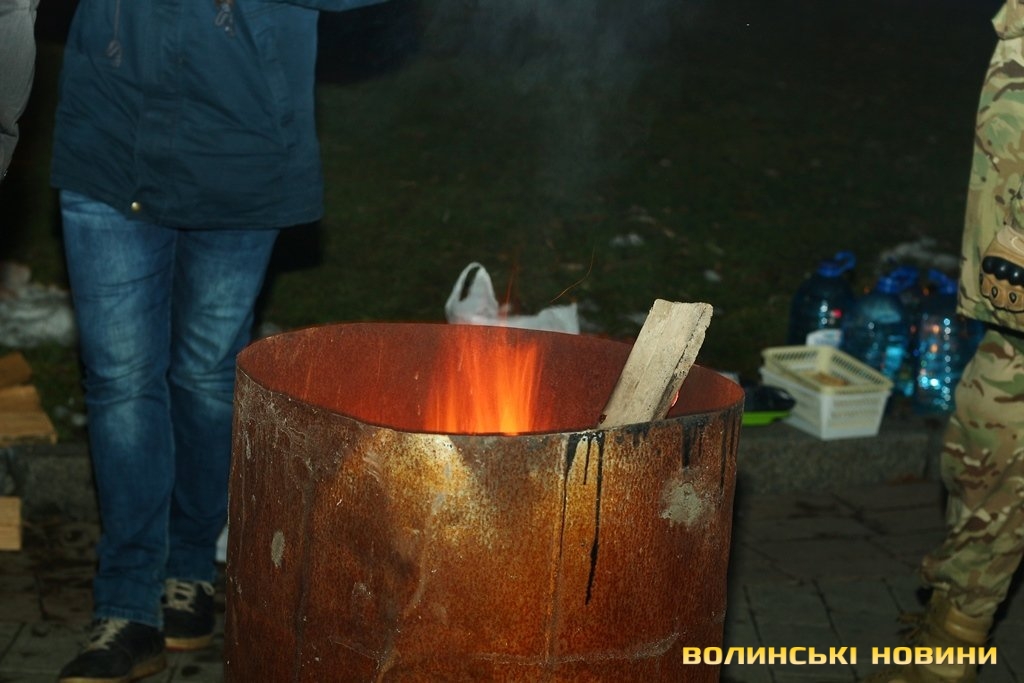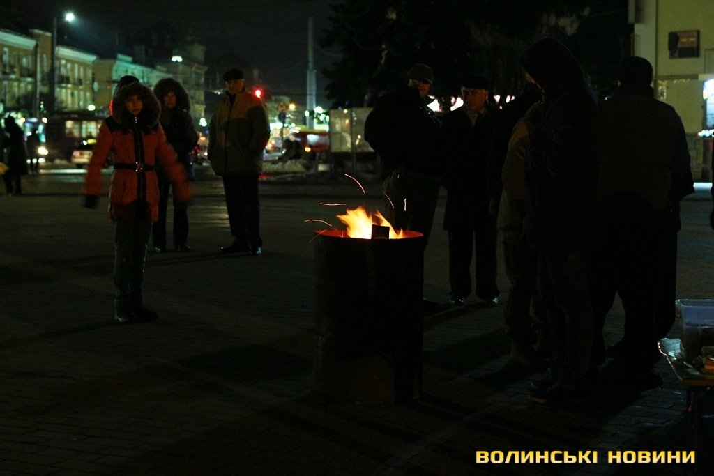 Отож увечері лучани почали гуртуватися біля фотостенду «Героїв Небесної сотні та загиблих за єдність України». На Театральний майдан принесли бочку, в якій запалили багаття, а поруч волонтери готували для змерзлих людей канапки.