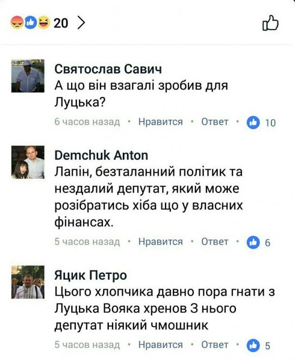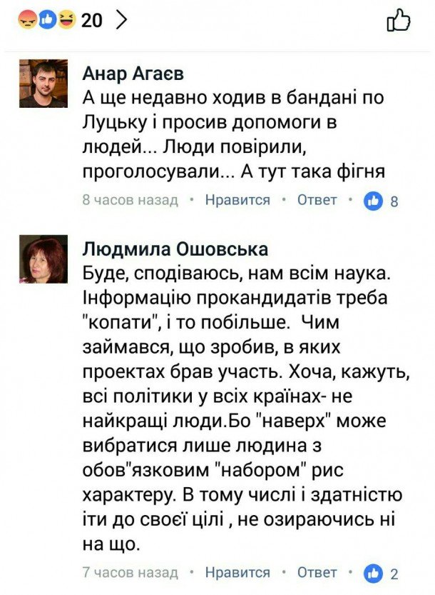 «А ще недавно ходив в бандані по Луцьку і просив допомоги в людей...Люди повірили, проголосували..А тут така фігня», - написав Анар Агаєв.Святослав Савич задається простим, та в той же час не дуже радісним питанням: «А що він взагалі зробив для Луцька?».«Давно пора відізвати», - обурюється місцевий житель Yurii Protas.