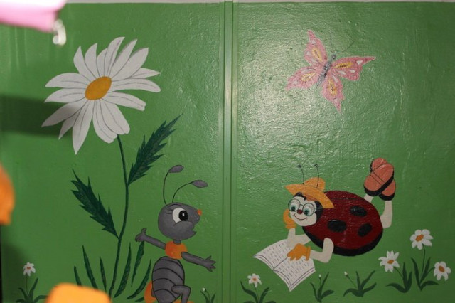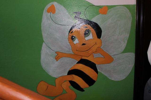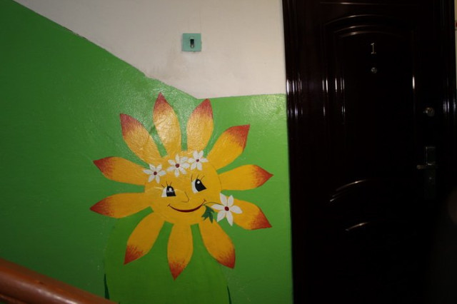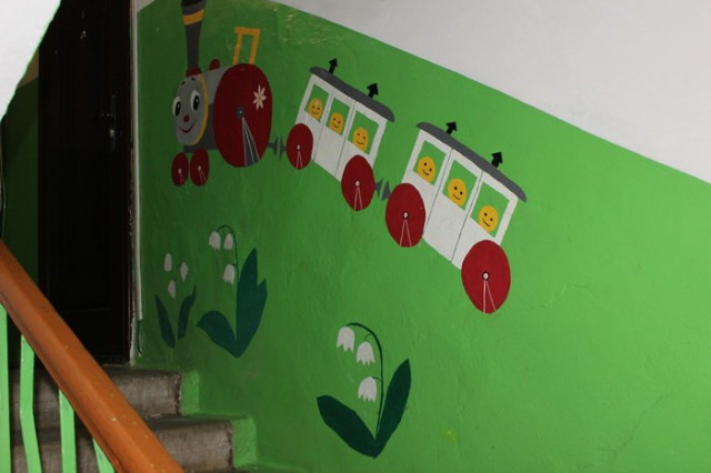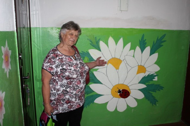 Жителі цього під’їзду розповіли, що ініціатором розписів стін є Олена Дікарєва. Пані Олена зізналася, що взяти до рук пензля її спонукало бажання перетворити похмурі зелені стіни у барвисту казку. Тоді вона й спробувала намалювати на стінах біля своєї квартири яскраві метелики, сонечка та барвисті квіти.Цю ініціативу підтримали сусіди, і їхній під’їзд перетворився у художню майстерню, де народжувалися неповторні сюжети. Люди розповідали, що хтось хотів зобразити героїв мультфільму, хтось сюжет улюбленої казки, а одна жінка сказала, що її надихнув малюнок, який вона побачила на дитячій піжамі. Сусіди й так ніколи не ворогували, а спільна праця їх ще більше здружила, - йдеться у повідомленні міськради.