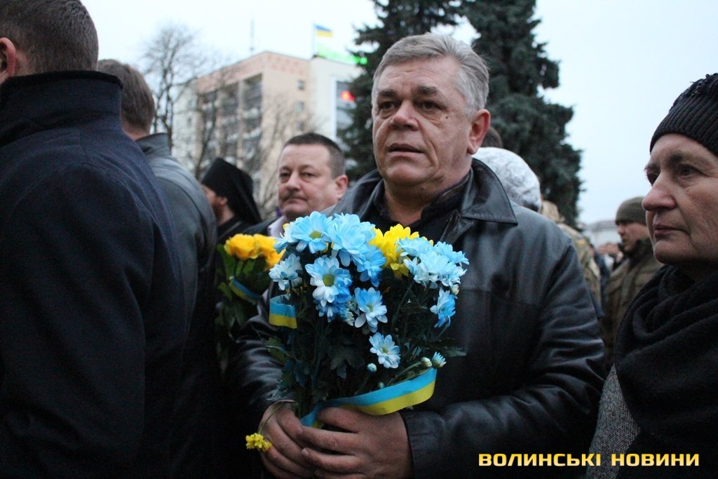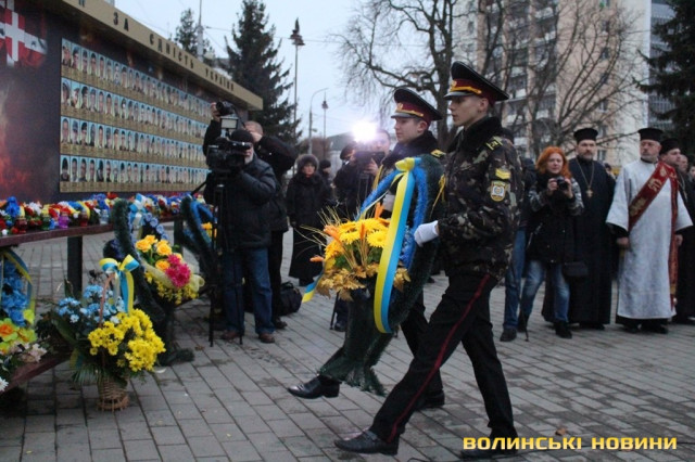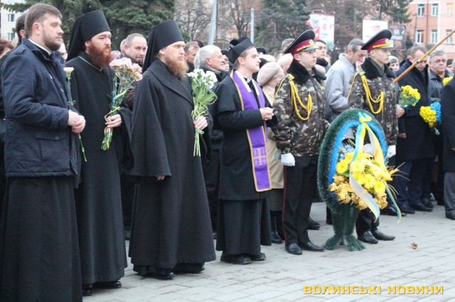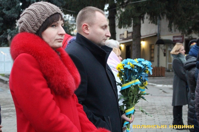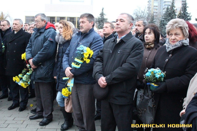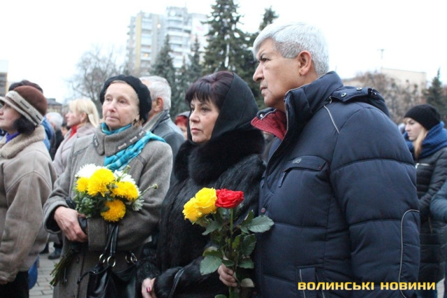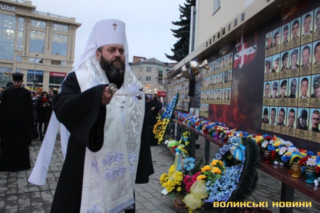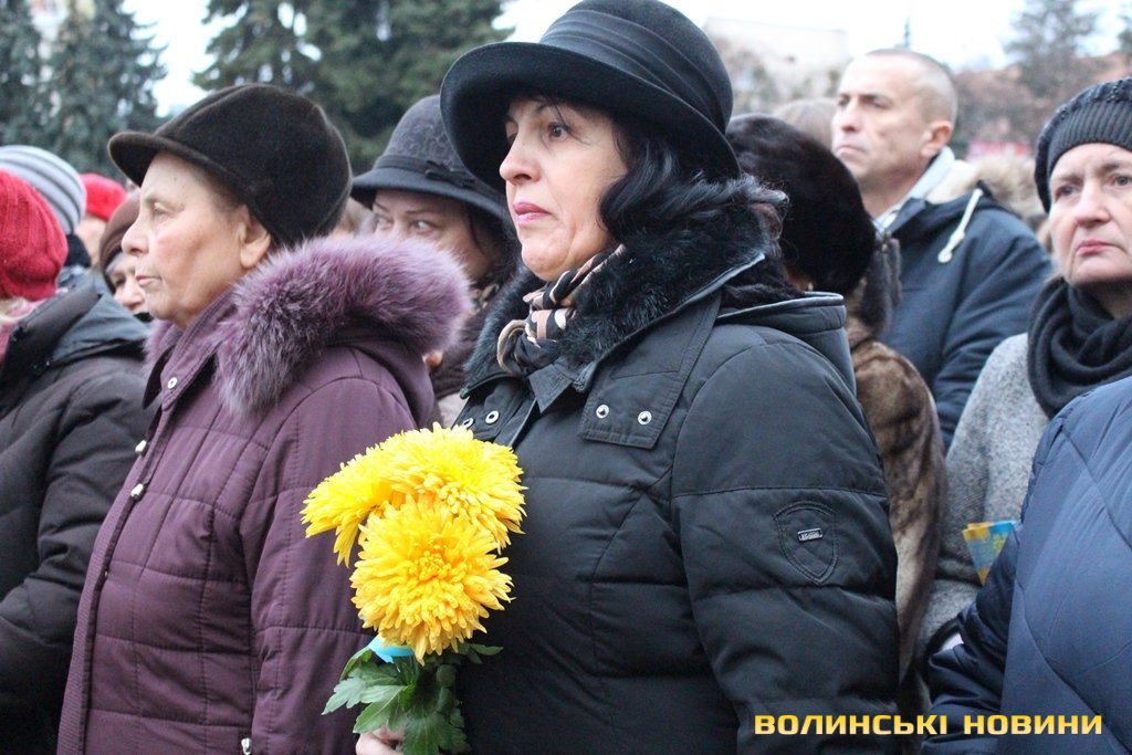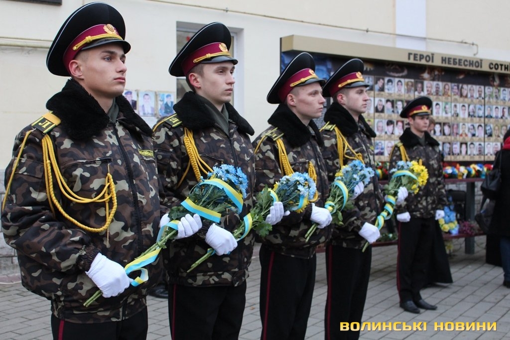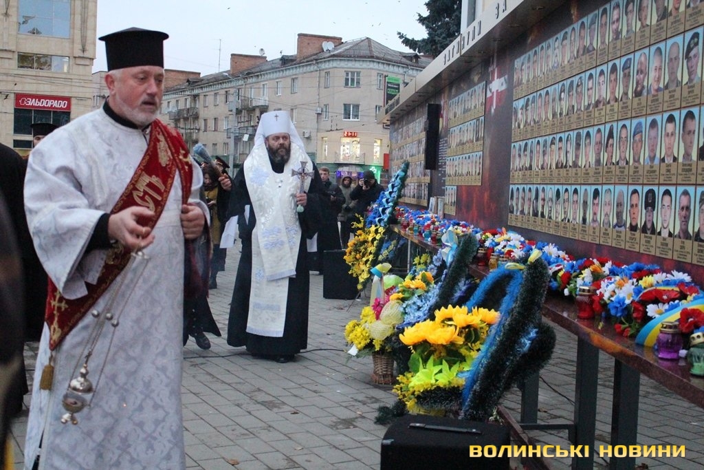 Так, 21 листопада лучани згуртувалися у центрі Луцька біля фотостенду «Героїв Небесної сотні та загиблих за єдність України», аби ще раз урочисто вшанувати Героїв, які поклали свої життя задля миру в Україні .На захід прийшли ветерани АТО, волонтери, родичі загиблих, представники влади, духовенства та просто небайдужі люди. Лучани зі сльозами на очах несли до стенду квіти та прапор України з Майдану.Митрополит Луцький та Волинський Михаїл помолився за усіх полеглих в боротьбі за свободу та незалежність України, освятив оновлену стелу пам’яті, та закликав усіх присутніх пам’ятати, що усі хто зображенний на стенді, віддали своє життя за правду.«Вони полягли, проклавши шлях до правди, і ми не маємо права її цуратися!» - сказав митрополит Михаїл.