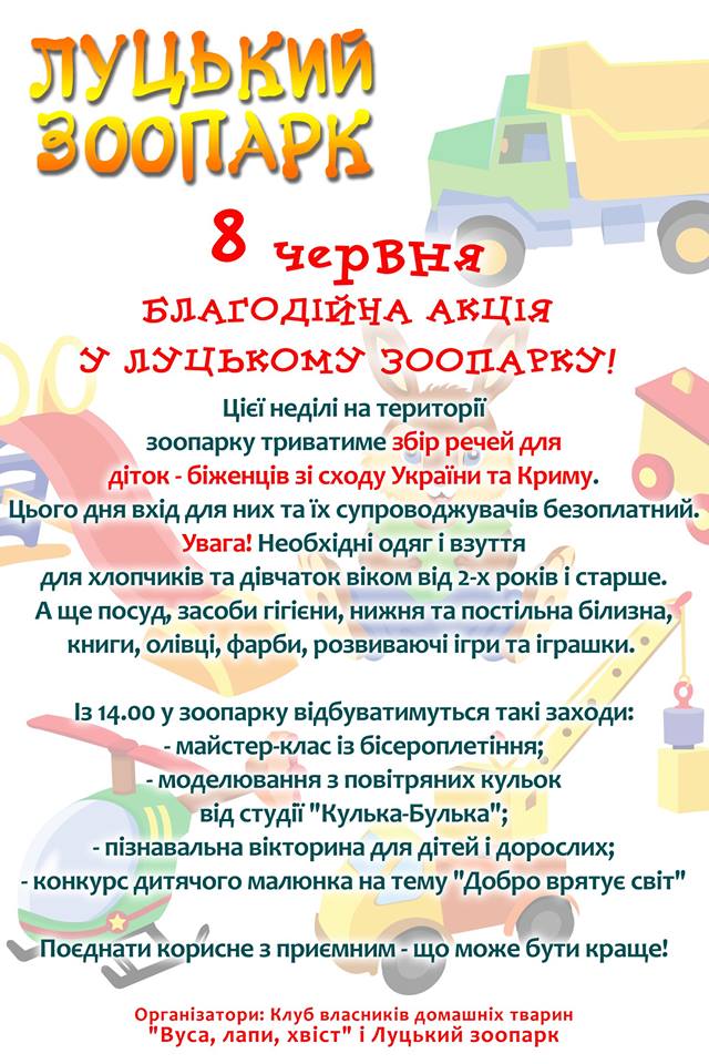 «Мамочки та татусі! У неділю, на свято Трійці, запланований благодійний збір речей для діток-переселенців зі Сходу України та Криму, які зараз перебувають у Луцьку та Волинській області. Допомагати приємніше особисто та «з рук в руки» - тому ви зможете познайомитись з цими дітками під час прогулянки у Луцькому зоопарку», - йдеться у повідомленні.