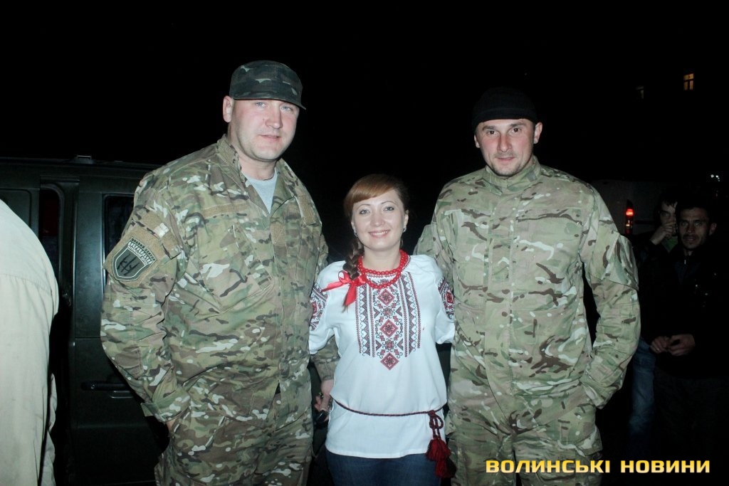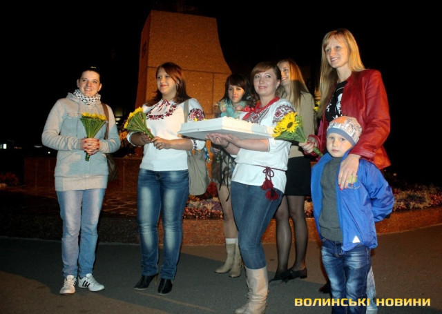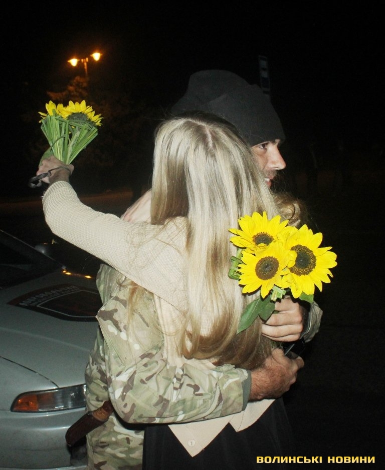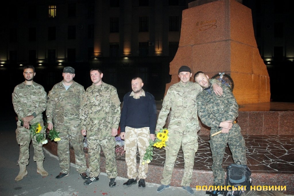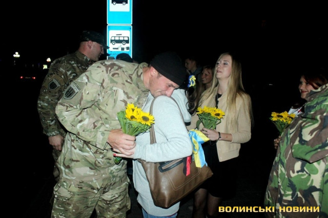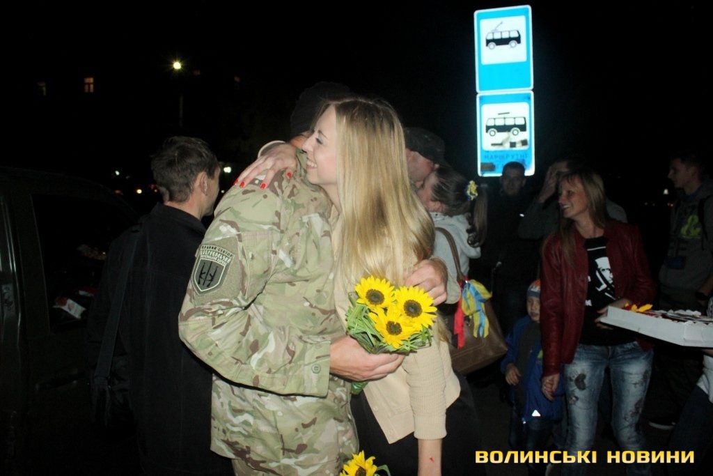 Зустрічали добровольців-волинян вигуками «Герої!» родичі, друзі та активістки із жіночої чоти «Правого сектора» 29 вересня поблизу пам’ятника Тарасу Шевченку у Луцьку.