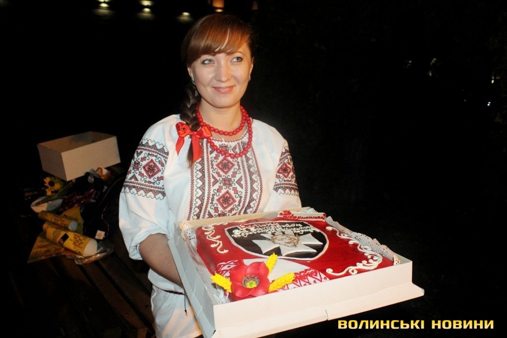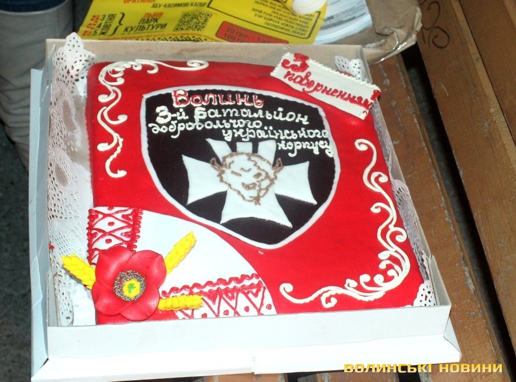 Як розповіла прес-секретар організації подруга Тінь, цього дня зустрічали бійців Третього запасного батальйону ДУКу, у лавах якого воюють волиняни. З її слів, постійно відбувається ротація добровольців. Так, наразі зустрічали тих, хто обороняв Донецький аеропорт (як відомо, у неймовірно запеклих боях аеропорт вдалося відстояти). Героїв у Луцьку вітали квітами та ексклюзивним тортом із символікою батальйону. Як розповіли добровольці, одночасно з ними шестеро волинян повернулися із зони АТО у Ковель.