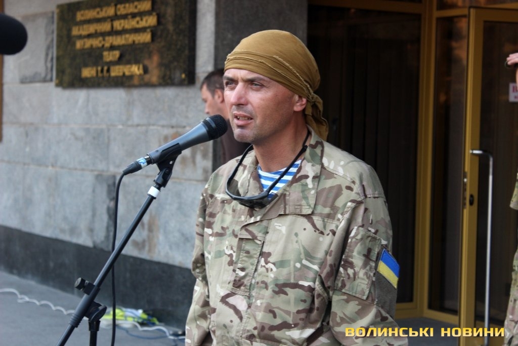 Він розповів, що Волинська рота – штурмовий підрозділ «Айдару», який здійснює практично всі бойові операції. Він представив громаді бійця Юрія, який виконуватиме обов’язки командира роти, доки Ігор Лапін лікуватиметься на Волині. Він побажав бійцеві бути розсудливим та врівноваженим.