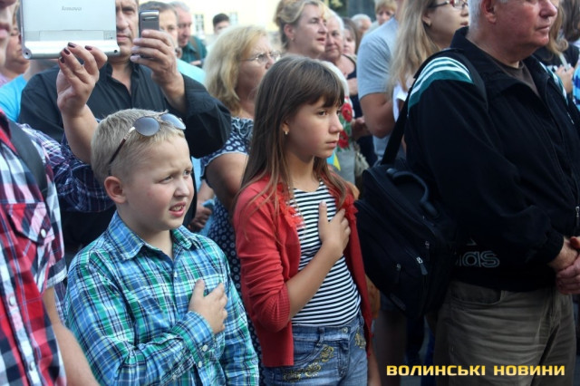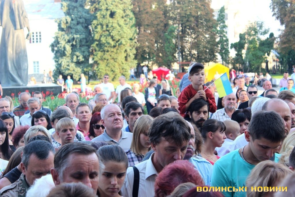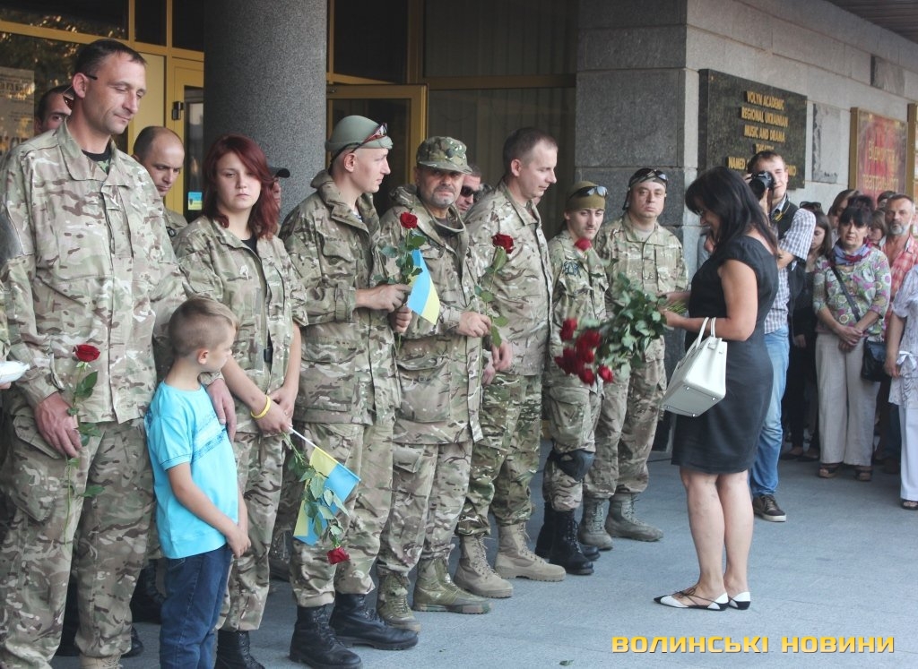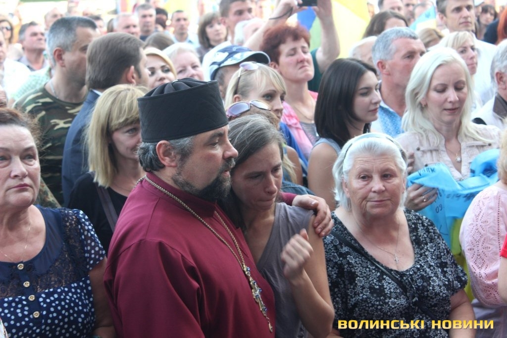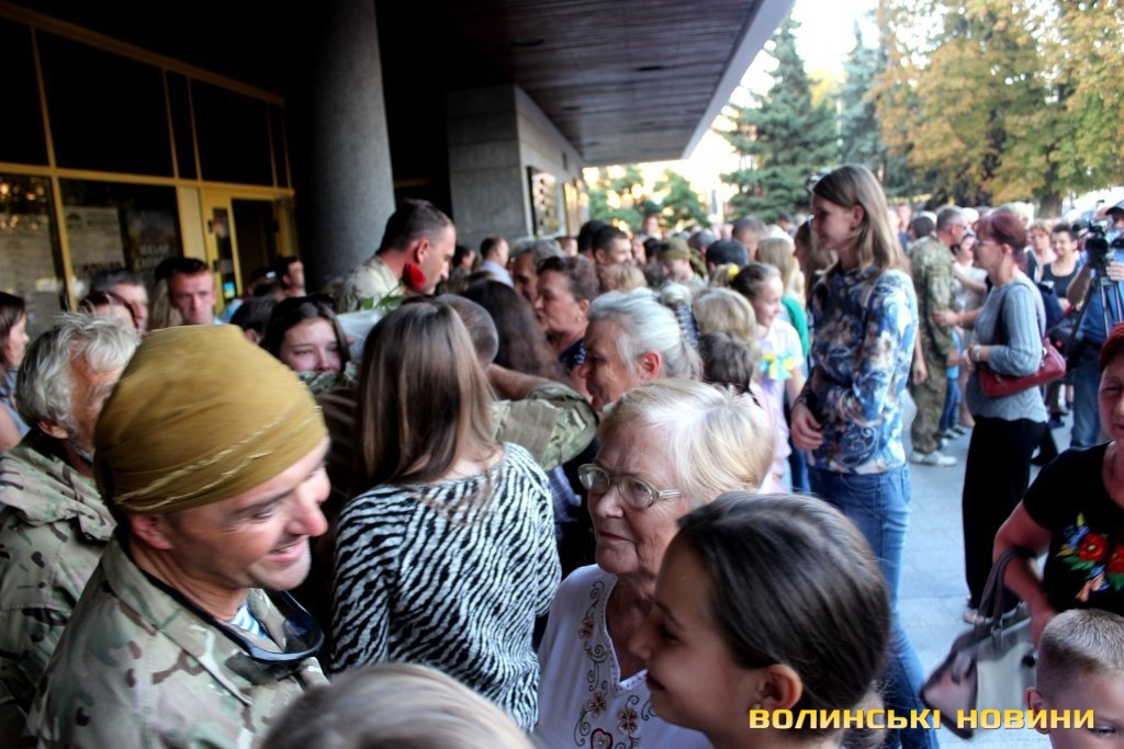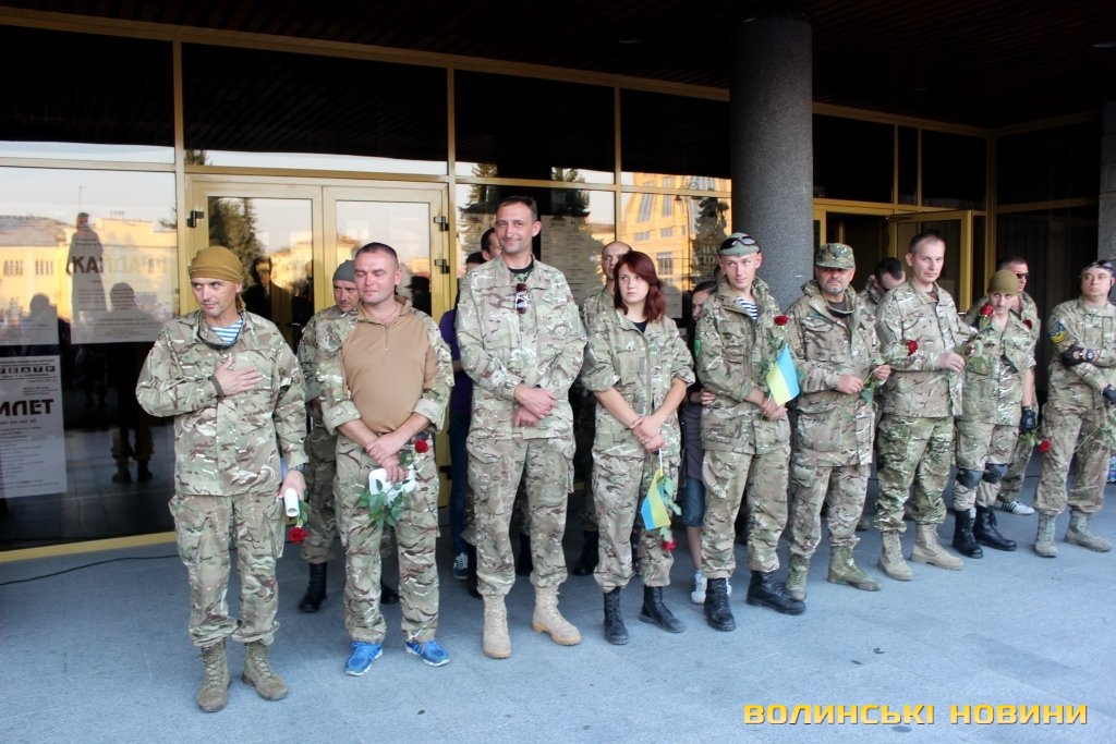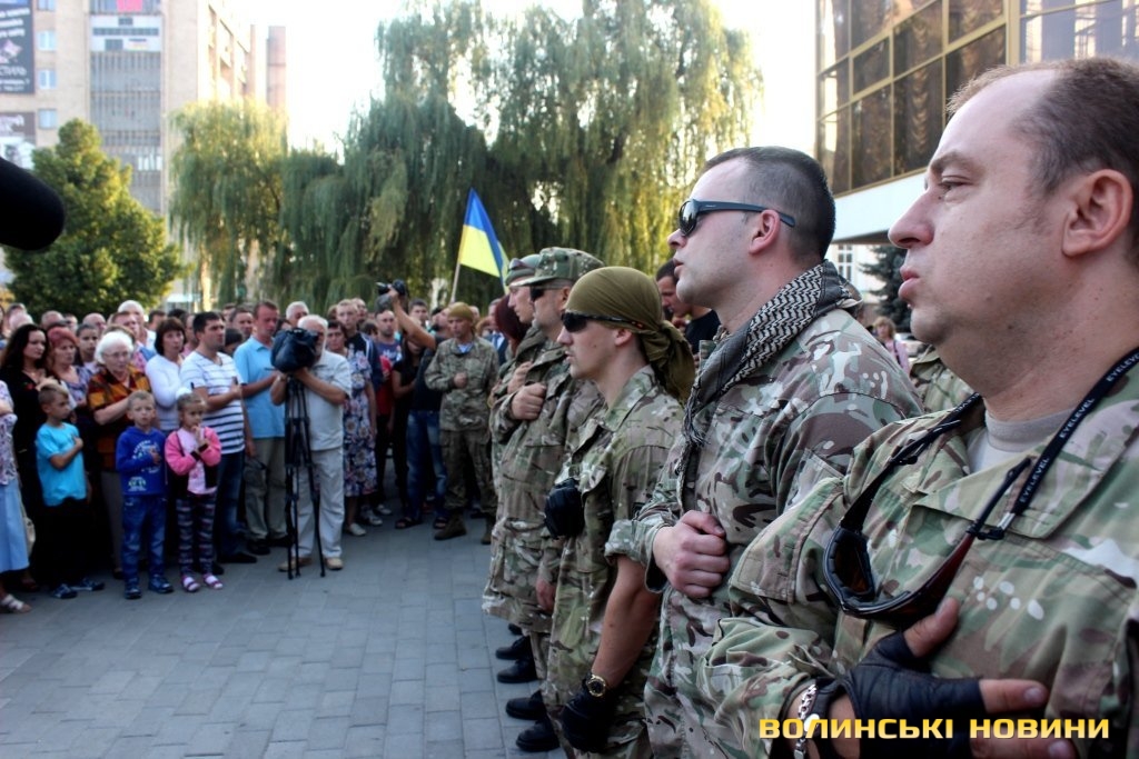 До громади звернувся командир другої Волинської роти батальйону, який нині перебуває на лікуванні, Ігор Лапін. Він закликав усіх хвилиною мовчання вшанувати пам'ять полеглих бійців. Від імені солдатів він подякував волинянам, завдяки підтримці яких бійці одягнені та ситі й мають чим воювати. З його слів, сьогодні не всі військові волиняни змогли бути присутніми, адже дехто загинув, дехто лікується в госпіталях. Ті, хто вже одужав, сьогодні знову вирушають на Схід. З його слів, небагато тих, хто вірить, що перемир’я буде тривалим і війна скінчилася.
