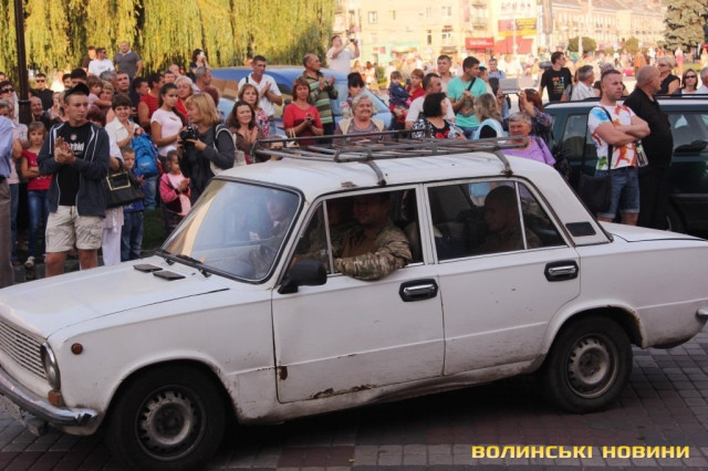 Автівки з бійцями радісними вигуками «слава Україні» вітали сотні лучан. Зустріч розпочали зі спільного виконання Гімну України.
