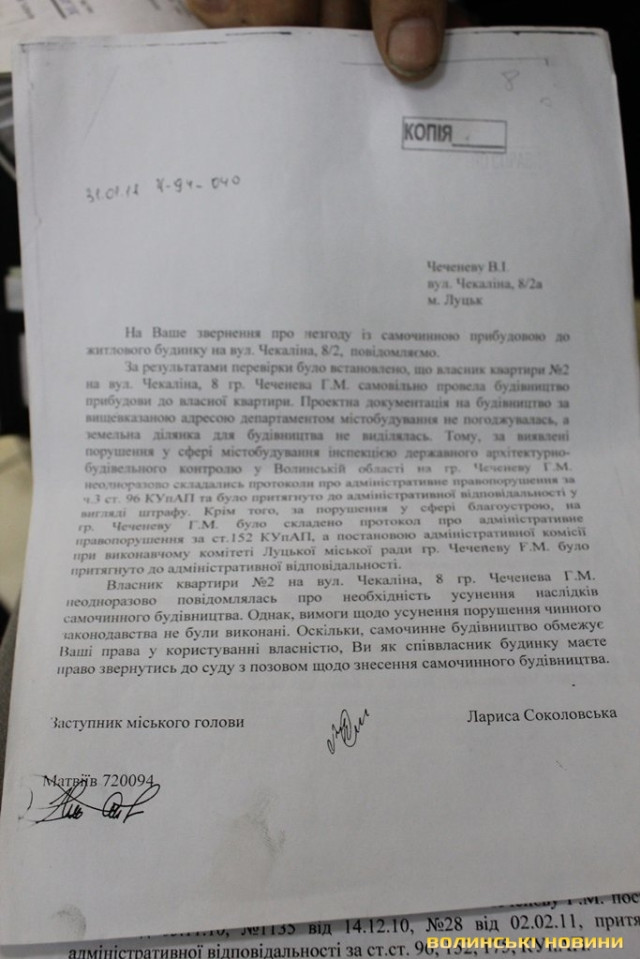 Лучанин Володимир Чеченєв стверджує, що заступник Луцького міського голови Лариса Соколовська спочатку «визнала, що прибудова незаконна, а згодом – відмовилась від власних слів».