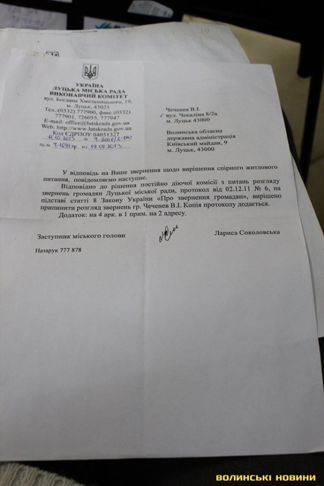 «Відповідно до рішення постійно діючої комісії з питань розгляду звернень громадян Луцької міської ради, вирішено припинити розгляд звернення», - відповіли лучанину.Зі слів лучанина, коли він звернувся за допомогою до начальника управління містобудування та архітектури Луцької міськради Ярослава Матвіїва, мовляв, прибудова колись на нього упаде, той відповів: «Ну що ж… У такому випадку вас поховають, а суд розбереться».
