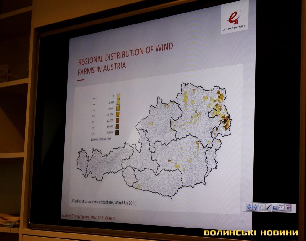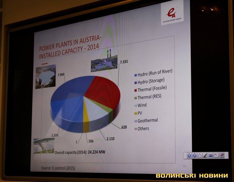 – Наступна зустріч якраз стосувалася зеленої енергії, відновлювальних і альтернативних її видів, яка відбувалася 8 жовтня в офісі Австрійського енергетичного агентства, де презентацію робив Гюнтер Паурітш, голова Центру енергетичної економіки та інфраструктури цього агентства. Виробництво енергії з відновлюваних джерел енергії має велике значення для Австрії і складає нині близько 30% усієї енергії. Так, гідроелектростанції забезпечують 11% споживання енергії , а біогаз та біопаливо близько 13%.