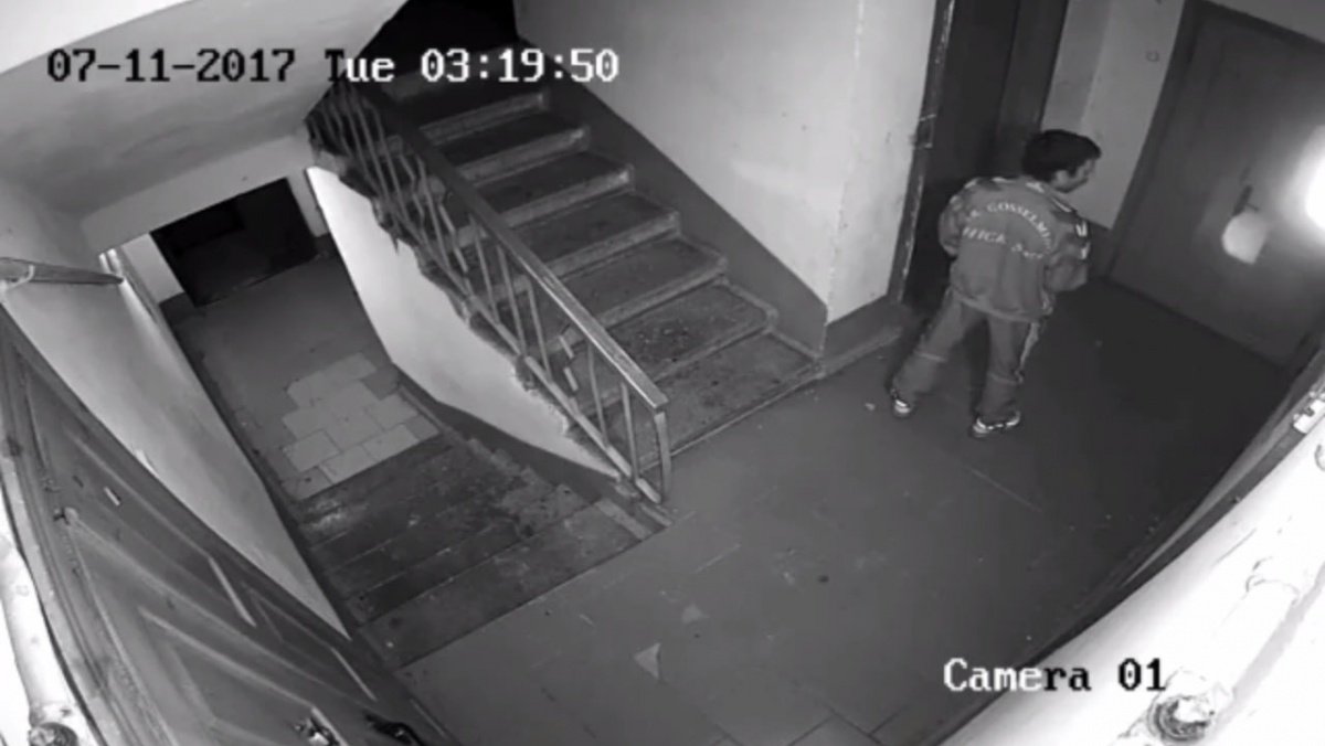 На відео видно, як у під’їзд заходить чоловік у спортивному костюмі й сідає у ліфт. Через деякий час, він же, тільки уже із натягнутою на голову кофтою та з пакетом у руці залишає будинок.