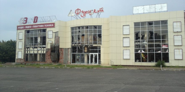 Трохи далі по вулиці від автовокзалу стоїть занедбаний супермаркет "Фуршет". У 2014-му будівля потрапила під обстріл, вцілілий товар вивезли, щоб не спокушати мародерів. Відтоді приміщення так ніхто і не відремонтував.
