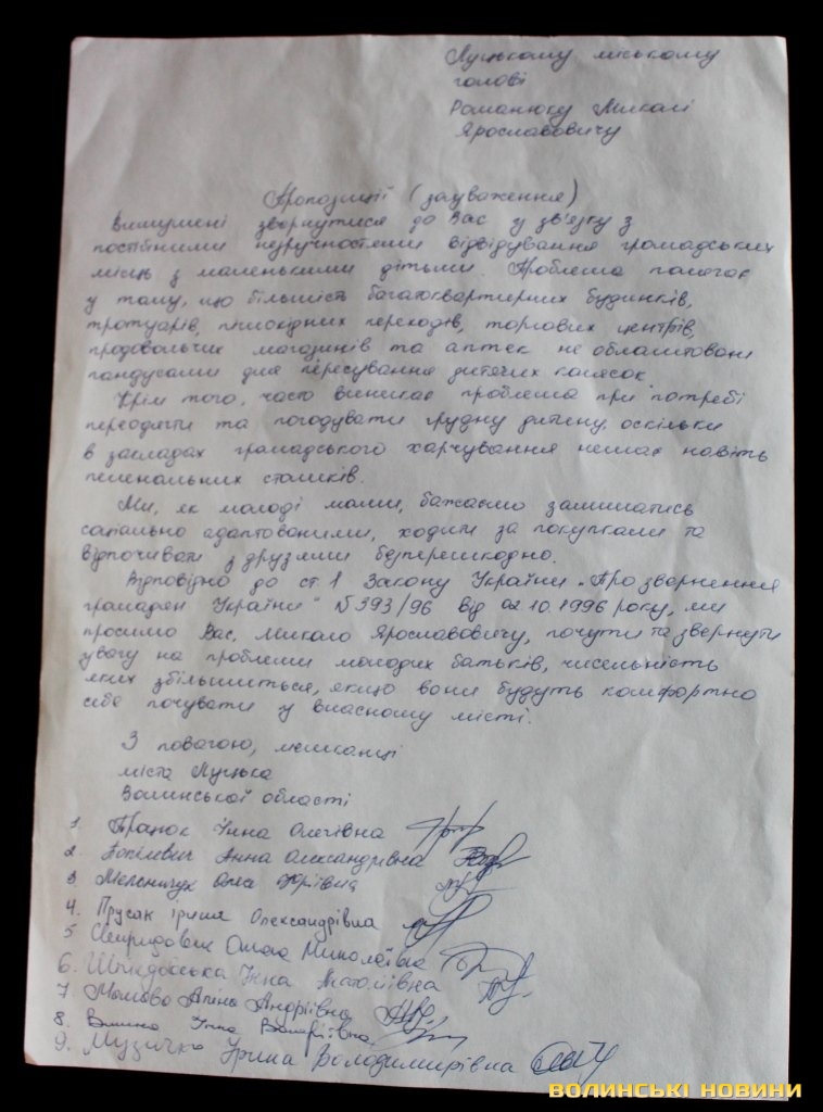 Відповідно до статті 1 Закону України «Про звернення громадян України» № 393/96 міського голову Миколу Романюка просять почути та звернути увагу на проблеми молодих батьків, чисельність яких збільшиться, якщо вони будуть комфортно себе почувати у власному місті.