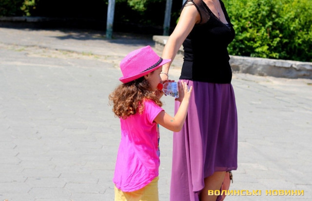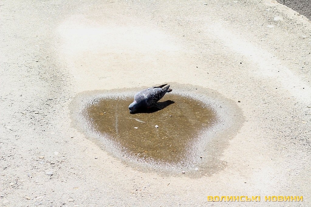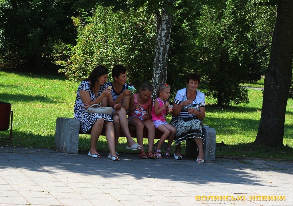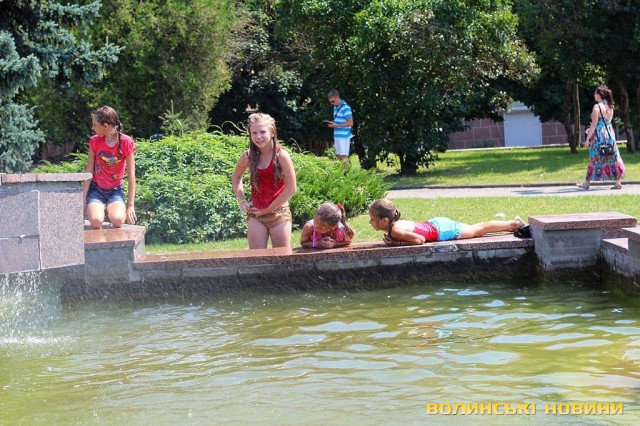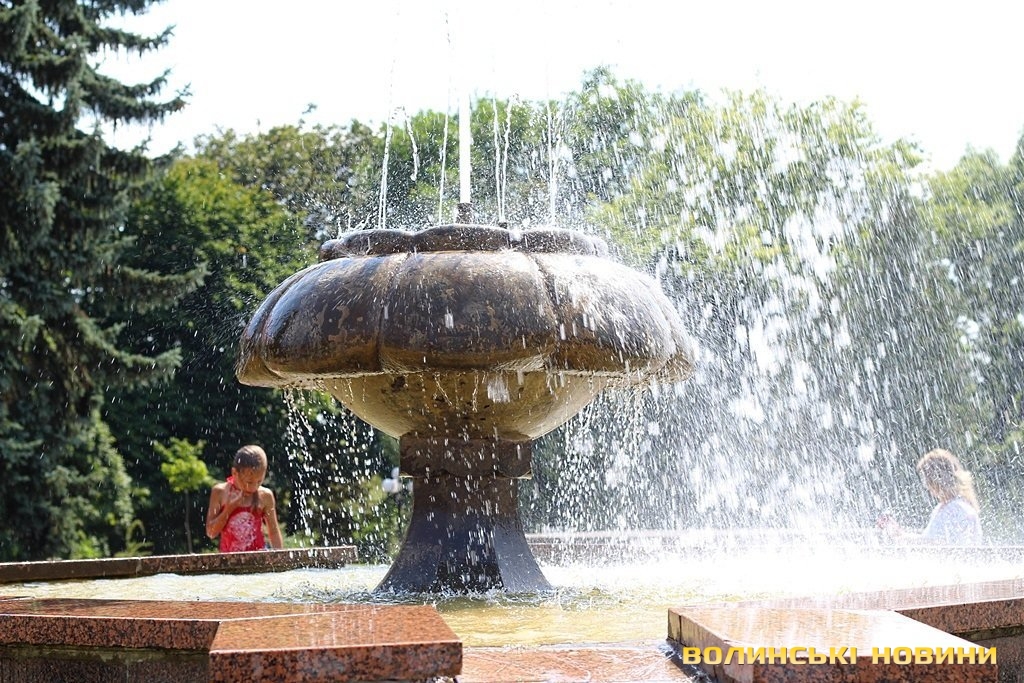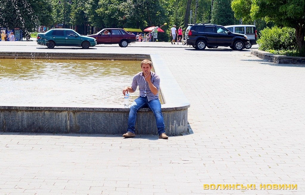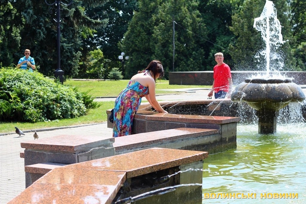 Найменші, не соромлячись, купаються та граються у міських фонтанах. Благо, їх не полінувалися увімкнути на вікенд.Дорослі ж грайливо бавляться руками у прохолодній воді, а дехто, поринаючи у солодке дитинство, щасливо тішиться струмочком води із маленького фонтану на Центральній парковій алеї.Спека. Організм потребує живильної вологи, а отже кожен другий волинян не виходить на прогулянку без пляшечки прозорої мінеральної води. Яке ж літо без великої порції смачного морозива, що хоч на мить дає відчуття прохолоди та свіжості.Коли стовпчик термометра зашкалює, голуби рятуються в калюжах, що ще не встигли повністю висохнути після останніх дощів, а ось коти та кішки, які не в захваті від водяної купелі, ховаються у затінку високої трави.Вулиці обласного центру - майже порожні, адже більшість краян ховаються від задухи у квартирах та будинках, очікуючи на прохолодний та по-батьківськи лагідний літній вечір.