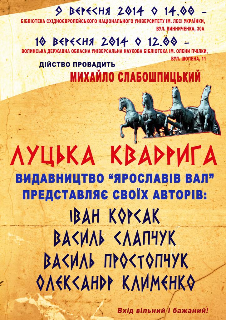 Літературне дійство відбудеться під промовистою і символічною назвою – «Луцька квадрига». Ведучий зустрічі – відомий письменник, критик, літературознавець, лауреат Національної премії ім. Тараса Шевченка, виконавчий директор Ліги українських меценатів, директор видавництва «Ярославів Вал» Михайло Слабошпицький.