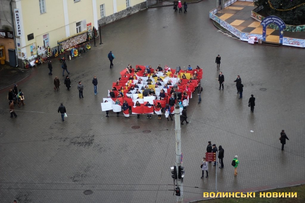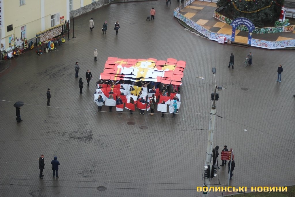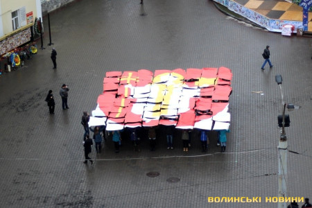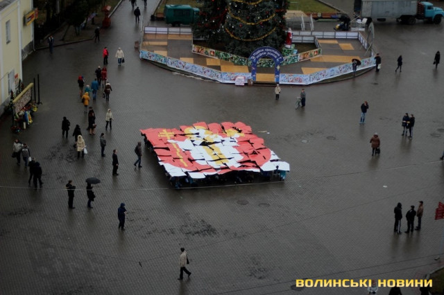 У центрі Луцька активна молодь організувала флеш-моб. 96 шматочків банера одночасно підняли догори і склали картину на якій зображений покровитель княжого міста – Святий Миколай.