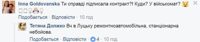 Відповідаючи на коментарі, волонтерка пояснила, що військова частина, в якій вона буде служити за контрактом, – ремонтноавтомобільна, стаціонарна, не бойова.
