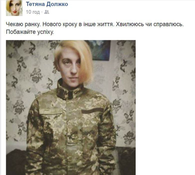 Вона розмістила на своїй сторінці фото у військовій формі та написала: «Чекаю ранку. Нового кроку в інше життя. Хвилююся чи справлюсь. побажайте успіху».