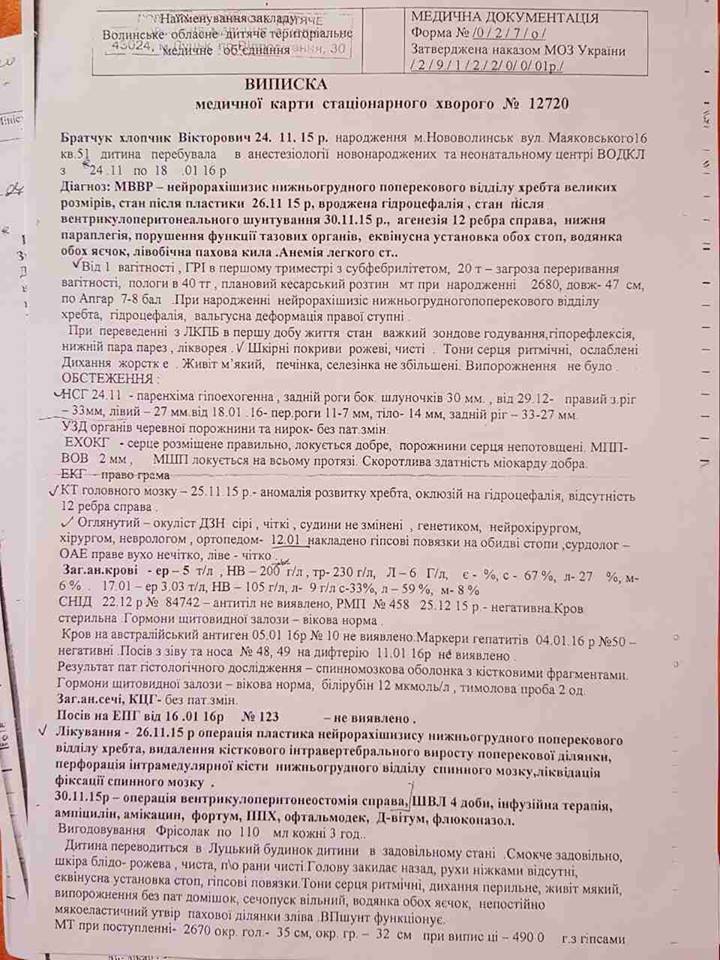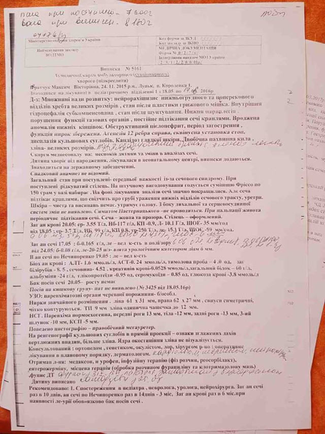 1. Серед головних проблем зі здоров’ям дитини є вада нирок (детальний діагноз описаний у виписках). Лікар з Волинської обласної дитячої лікарні направляє в Інститут урології (Київ). Для операції та лікування там треба гроші. Десь в районі 100 тисяч гривень. Поки все фінансове навантаження на себе бере сім’я. Я вважаю, що нам варто їм допомогти.
