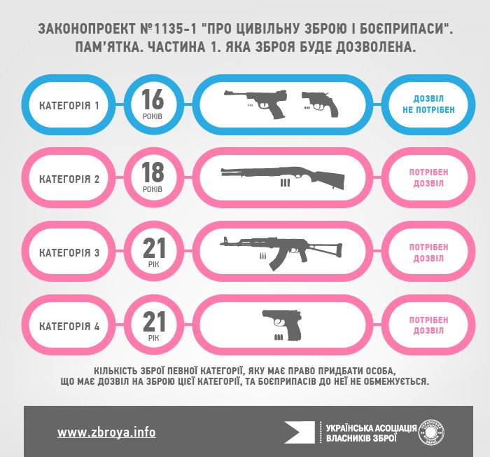 Статтею 4 цього законопроекту пропонують встановити, що цивільна зброя першої категорії, а також деактивована зброя перебувають у вільному обігу, а для володіння зброєю другої, третьої і четвертої категорій та боєприпасами до неї потрібен дозвіл. Інфографіка Української асоціації власників зброї