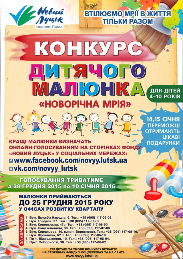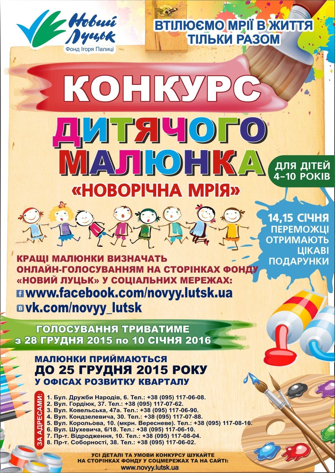 Фонд Ігоря Палиці «Новий Луцьк» оголошує конкурс дитячого малюнка «Новорічна мрія». До участі запрошуємо дітей віком від 4-х до 10-ти років. Роботи на конкурс приймаються до 25 грудня.