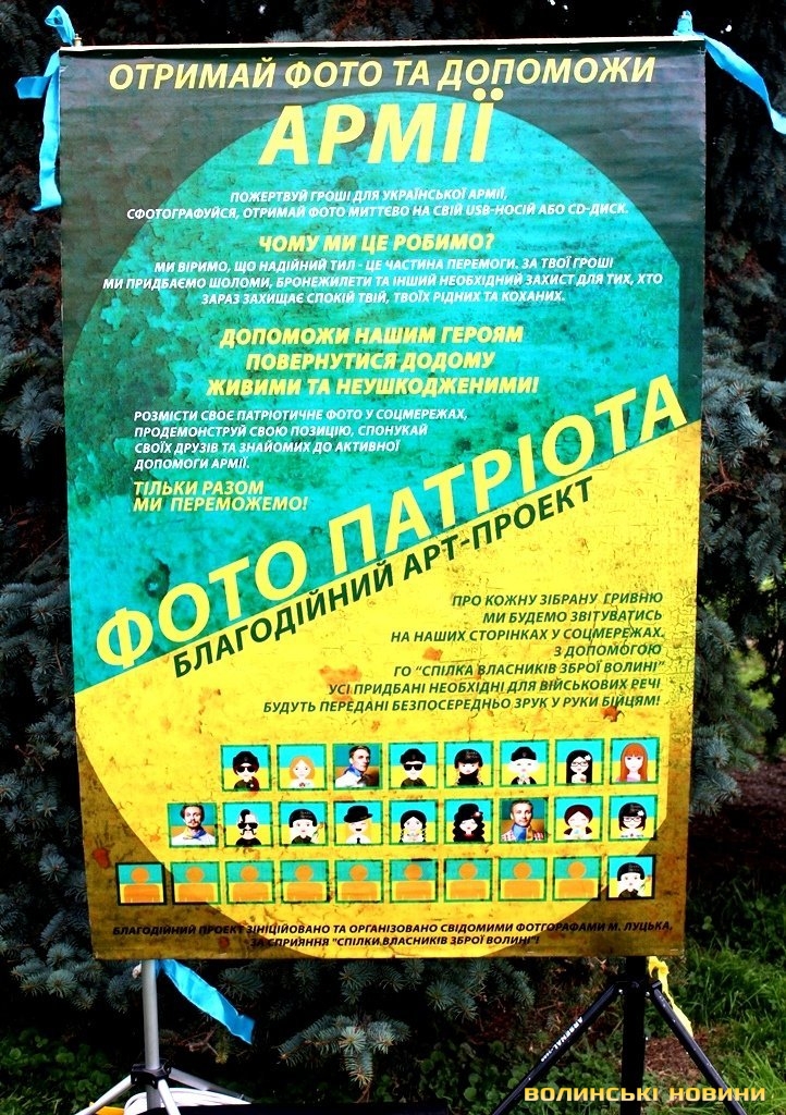 «Разом з луцькими фотографами ми об’єдналися навколо спільної ідеї – допомогти українському війську, а конкретно - нашим землякам, які воюють на Сході. Так, ми робимо патріотичні фотографії, а кожен дає стільки грошей, скільки може», - розповідає автор ідеї Ірина Мельник.
