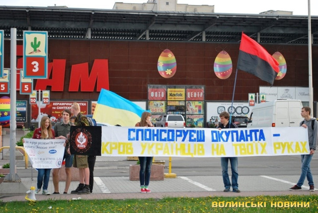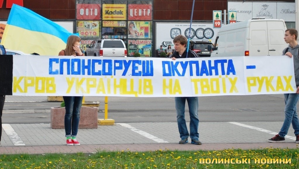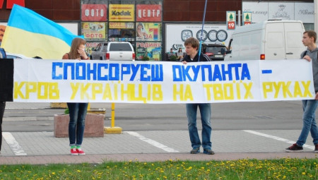 Плакати «Спонсоруєш окупанта – кров українців на твоїх руках» виставляли перед магазинами представники громадської організації «Іскра» сьогодні, 24-го квітня.
