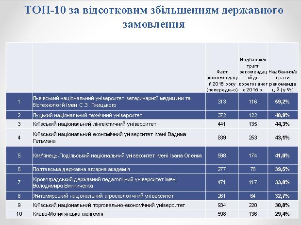 Міністерство освіти та науки опублікувало перелік з 20 вишів, які отримали найбільше додаткових місць, оплачуваних з державного бюджету, під час вступної кампанії 2016. Рейтинг опублікувала на сторінці у мережі Facebook заступник міністра освіти та науки Інна Совсун.