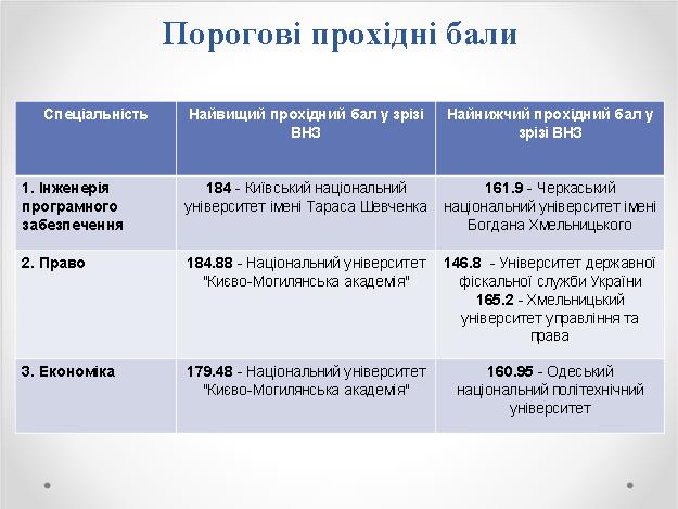 Варто зауважити, що у переліку вузів за абсолютним збільшенням державного замовлення опинилися й наші місцеві ВНЗ. Так, Луцький національний технічний університет зайняв 12 сходинку, а Східноєвропейський національний університет імені Лесі Українки - 13. За відсотковими показниками найбільше виграли регіональні виші.Найвиші прохідні бали за трьома популярними спеціальностями були у київських КНУ імені Шевченка та "Києво-Могилянської академії".