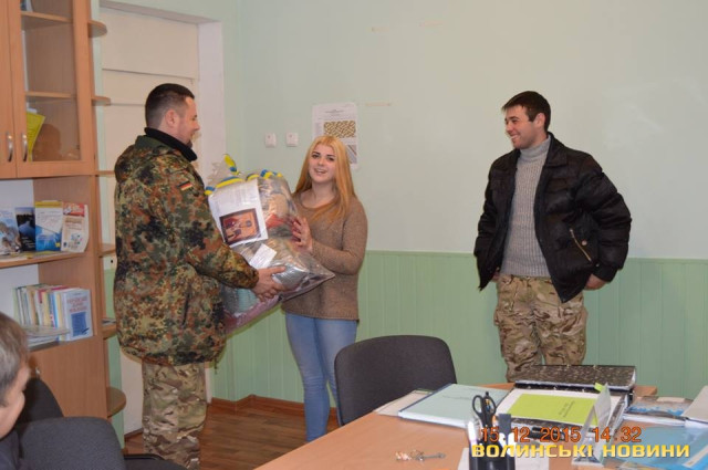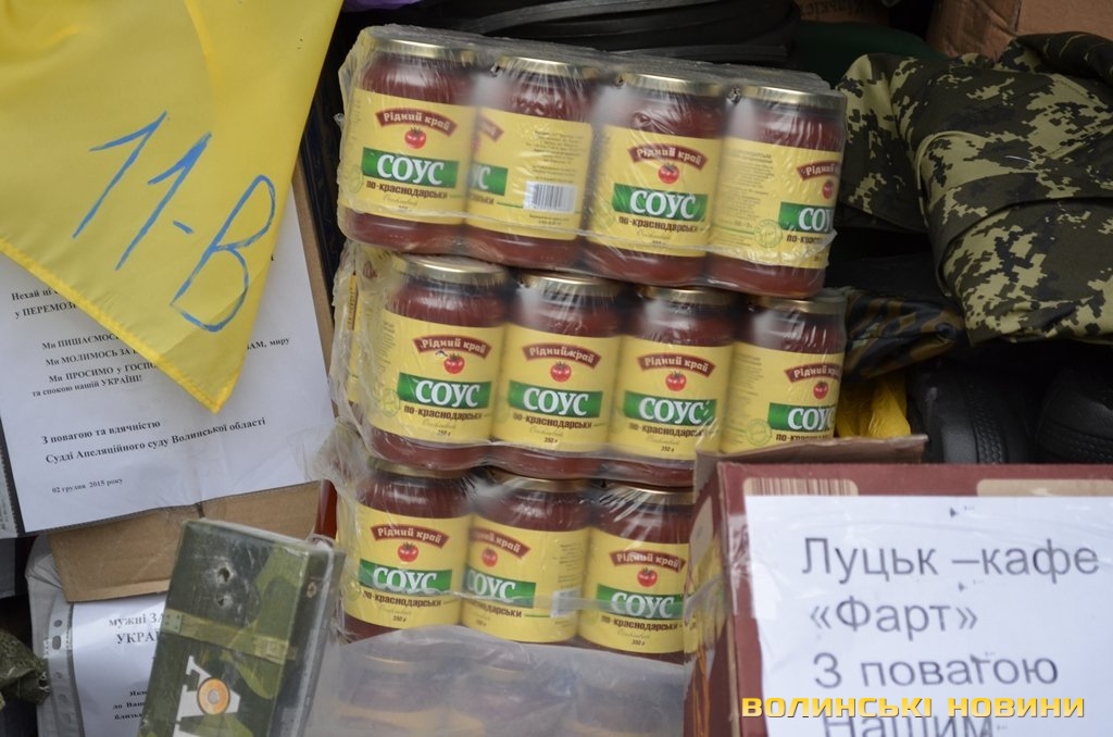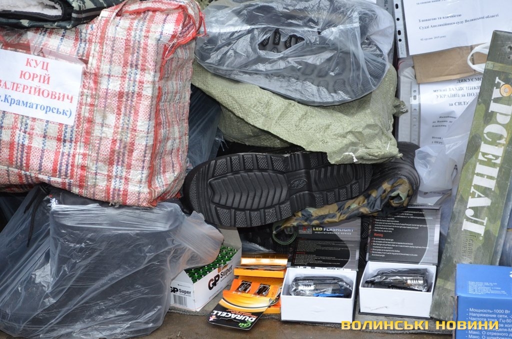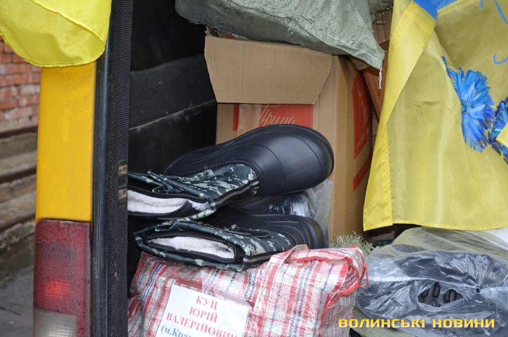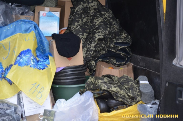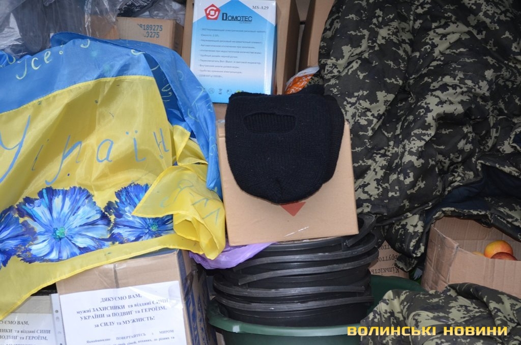 Серед благодійної допомоги, яку зібрали волонтери, – чоботи-«дутіки», 100 пар теплих рукавиць, зимові військові форми, ліхтарі та батарейки для розвідки, балаклави, 300 пар шкарпеток, 100 пар устілок, светри, 50 пар берців, бушлати. Також передають інструменти та рідину для автомобіля – антифриз. Інша частина допомоги – це солодощі (закупив Апеляційний суд у Волинській області ), яблука та інші продукти харчування. УКРОП придбав берці, балаклави, бушлати, одяг, гумові чоботи на суму 37 тисяч гривень.