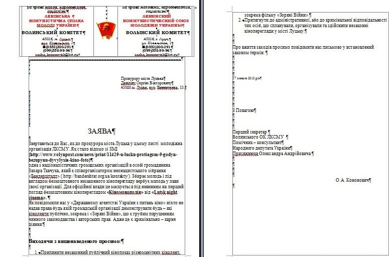 «Адже це – кримінально каране діяння», – йдеться у повідомленні Кононовича. Отож, він вимагає від прокурора Луцька припинити публічний кінопоказ та притягнути винних до адміністративної або кримінальної відповідальності.