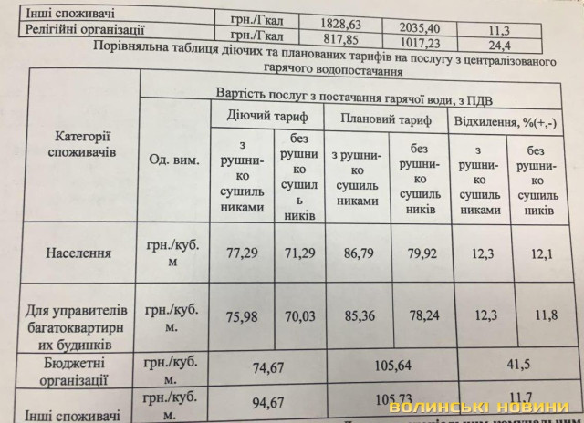Так, передбачено, що для населення тарифи на опалення збільшаться у середньому на 13 %, а на гаряче водопостачання – на 12 %.Директорка ДКП «Луцьктепло» Валентина Малютіна додала, що підвищені тарифи також покриватимуться субсидіями від держави. Вона підкреслила, що витрати підприємства не закладені в тарифах, а підвищення пов'язані зі збільшенням ціни на газ.