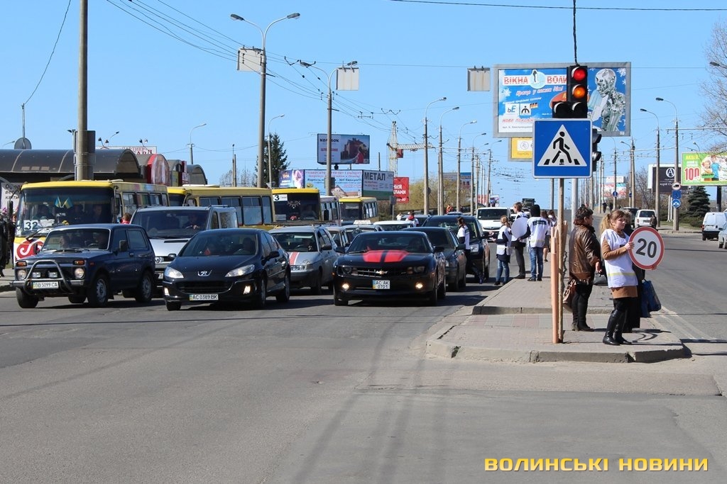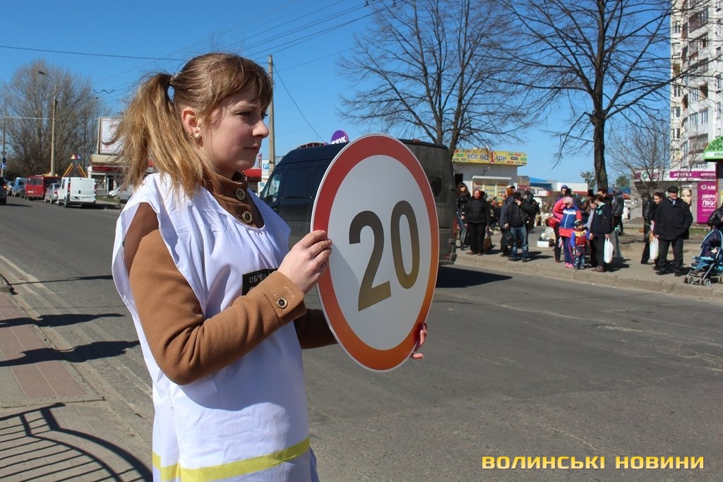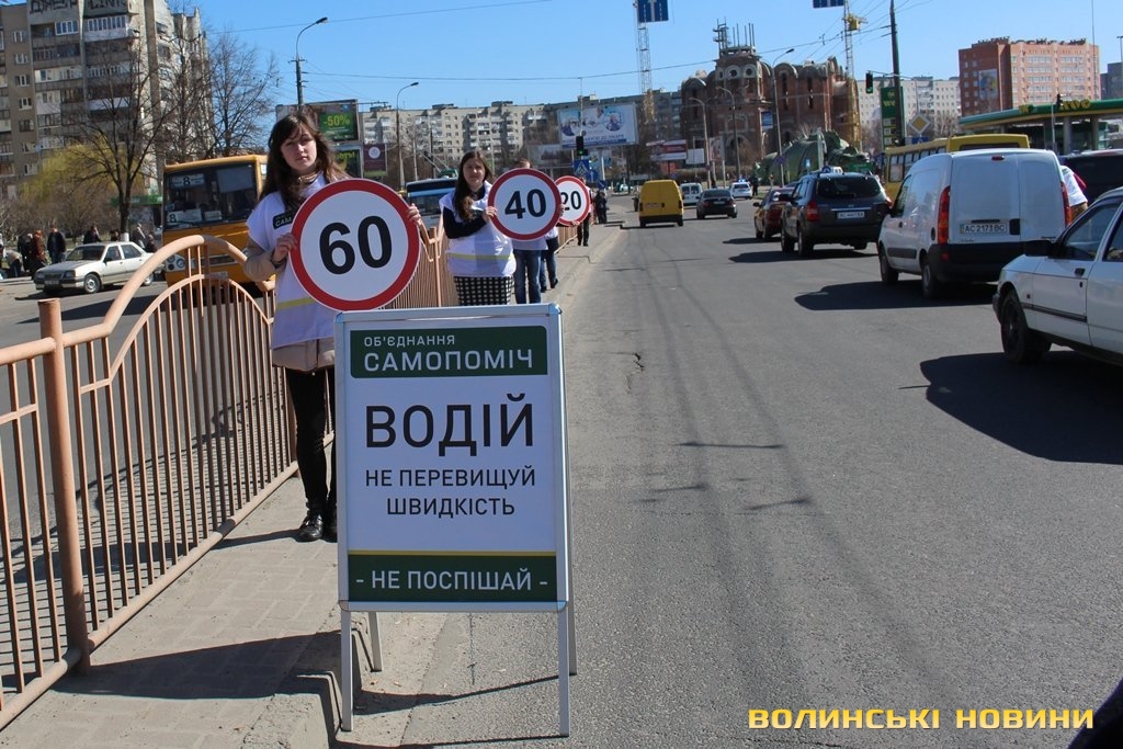 Як розповіла один із координаторів акції, представниця ГО «Самопоміч» Юлія Вусенко, цей об’єкт обрали тому, що напередодні Великодніх свят чимало лучан приїздять купувати продукти на ринок та в супермаркети. Крім того, на цій ділянці дороги завжди надзвичайно інтенсивний рух.Відтак, учасники флешмобу нагадували водіям про обмеження швидкості біля пішохідного переходу та про те, що дорожньо-транспортні пригоди часто призводять до плачевних наслідків. Мета заходу - інформування водіїв та пішоходів про те, що дотримання Правил дорожнього руху зберігає життя та здоров’я тих, хто є взаємоввічливими на дорозі та дотримується правил.