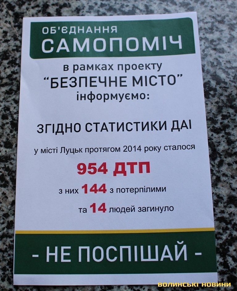 Власне, подібні акції планують проводити в містах, де є осередки ГО «Самопоміч». Однак, окрім флешмобів у рамках проекту «Безпечне місто» заплановані навчання Правил дорожнього руху в садочках та школах Луцька.