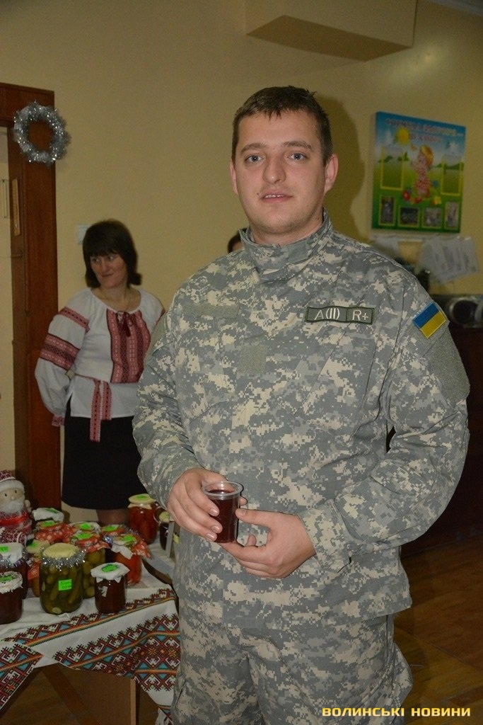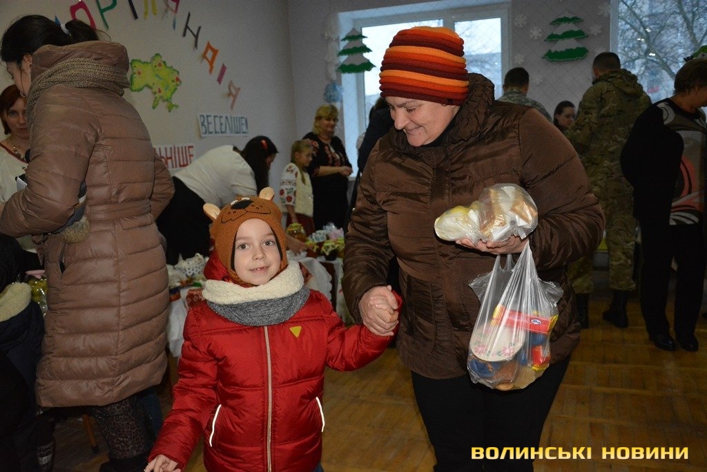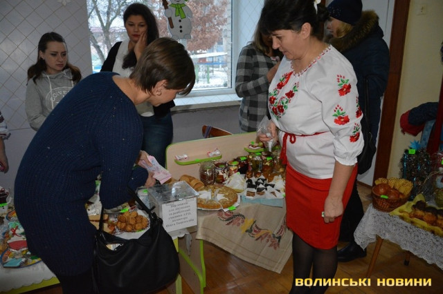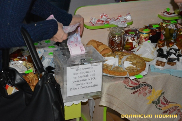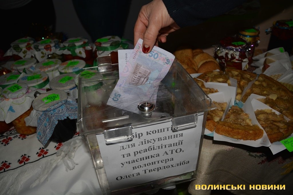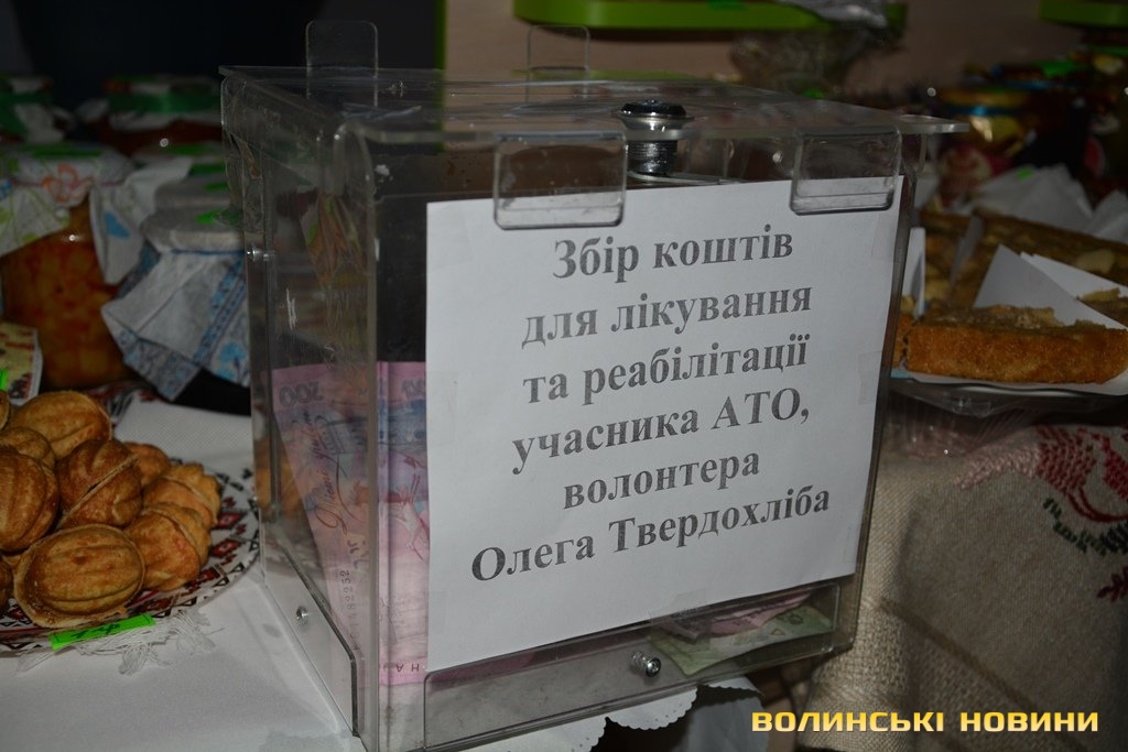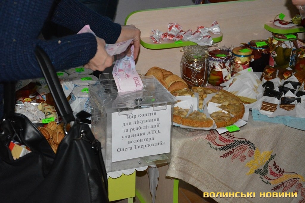 Як розповіла заступниця голови батьківського комітету однієї з груп ДНЗ Катерина Семенюк, її чоловіка мобілізували до лав Збройних сил України. Згодом, після демобілізації, він пішов на контрактну службу у ЗСУ. Тому жінка не з чуток знає, як непросто бійцям на передовій, як сумують вони за рідними, і наскільки для них важлива увага всіх, хто вболіває за рідну країну, прагне зберегти мир у своєму місті, захистити свою сім’ю.Бійці колишньої 51 бригади Павло Ковальський та Віталій Манченко теж були присутні на ярмарку. Як розповів Павло, він виховувався у цьому садочку, зараз у ньому працює вихователем його мама, а побратим Віталій прийшов підтримати усіх разом. Боєць каже, що є членом ГО «Спілка воїнів АТО Волині», яку очолює Олег Твердохліб.Він добре знає цього мужнього воїна і тішиться, що у нас є такі патріоти та фахівці військової справи. Він і його побратими, разом з волонтерами, підтримують нині Олега і бажають йому якнайшвидшого одужання.Завідувач дошкільного закладу Людмила Нагірна розповіла, що ініціатива підтримати бійця надійшла від батьківського комітету. Відтак, заздалегідь домовилися про збір необхідних речей, у тому числі і для діючих військових, тих, хто нині в окопах. Всі охочі батьки змогли приєднатися до цієї акції. Вони приносили теплі речі, засоби гігієни, медикаменти, консервації та різноманітні патріотичні листівки, щоб передати хлопцям на схід у переддень новорічно-різдвяних свят. А на ярмарок, з її слів, батьки приготували переважно смаколики, декоративні прикраси, вироби ручної роботи та інше.Окрім того, на заході розігрували безпрограшну лотерею. А ще була скринька для збору коштів від усіх тих, хто прагнув фінансово долучитися до збору допомоги для Олега Твердохліба.У підсумку, під час благодійного ярмарку вдалося зібрати 6 тисяч 285 гривень. Того ж дня бійці разом із волонтеркою ГО «Яворина» Русланою Вознюк, яка теж була присутня на заході, відвезли кошти додому бійцеві, якого саме на свято Миколая відпустили з лікарні.До слова, всього на післяопераційну реабілітацію та хіміотерапію для Олега Твердохліба необхідно зібрати 450 тисяч гривень.
