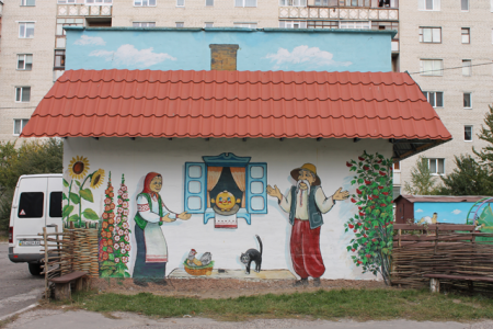 Казкова трансформаторна підстанція яскраво завершує дворове оновлення. Поки на одній стіні Дід і Баба стережуть Колобка, на другій Коза відчиняє двері хати, де її чекають козенята, а підступний Вовк злиться, що не встиг їх обдурити.
