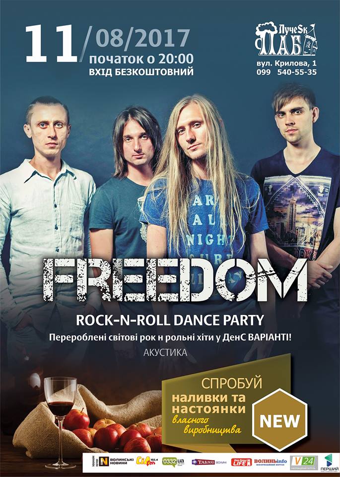 Так, у Луцьку 11 серпня о 20.00 у ЛучеSк-пабі (вул. Крилова 1) звучатиме програма з найпотужніших авторських композицій Freedom, а також драйвові кавери у власній обробці на Rolling Stones, ZZ Top, The Beatles, Elvis Presley, Led Zeppelin, Pink Floyd та інших.