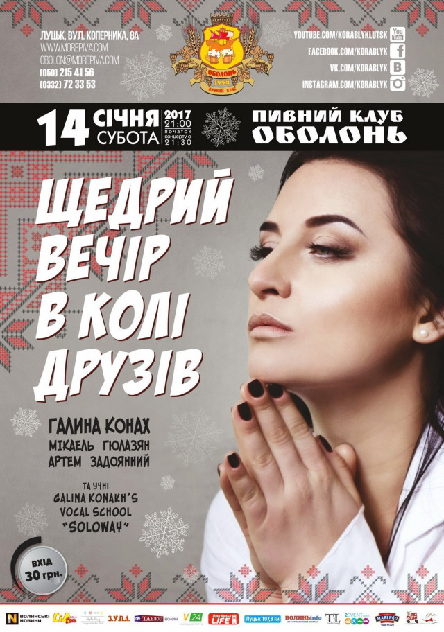 "Кожен концерт Галини Конах у Кораблику - це однозначно ексклюзив! Щоразу волинська співачка готує шось особливе і таке, чого не було "в попередніх серіях". От і на цей раз концерт буде наповнений купою сюрпризів. Наприклад, вперше з Галиною та Мікаелем гратиме на сцені Артем Задоянний. А ще виступатимуть кілька дітлахів та молоді, які навчаються в "Galina Konakh's vocal school SoloWay" і які теж мають, що вам показати та заспівати. Словом, щедрий вечір буде дійсно щедрим на теплі враження та емоції.