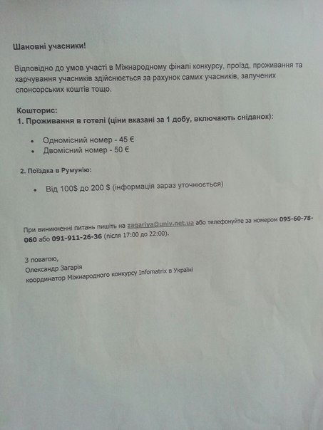 Справжній міжнародний конкурс (олімпіада) мають спонсорів (бюджет) і їхня ціль знайти розумну людину і зробити все щоб він навчався у них ( в країні) тому вони не беруть грошей за проживання а іноді навіть компенсовують витрати на проїзд за наявності підтверджуючих документів - а це сумнівна подія з сумнівним папірцем-запрошенням і дуже сумнівним листом-кошторисом витрат - тому скоріше за все така відповідь у фонді