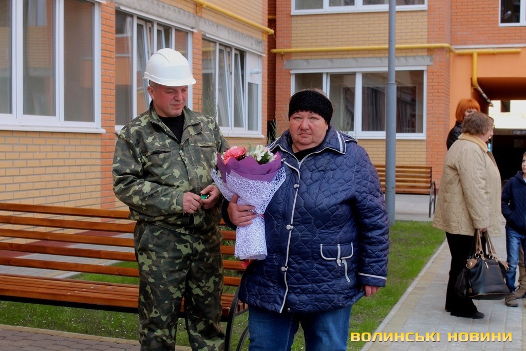 Ключі від перших двох квартир вручили матері загиблого Романа Лучука Тамарі Решетар та батькові Олега Вишневського - Анатолієві. Чоловік не зміг прийти, бо має проблеми зі здоров’ям, тож уповноважили отримати ключі брата та сина полеглого воїна.Саме ці родини, переконують у спілці родин загиблих учасників АТО «Надія», найбільше потребують покращення житлових умов. Це вирішили члени організації на загальних зборах. Приміром, мама загиблого 20-річного Романа, Тамара Решетар, досі мешкає у маленькій кімнаті в гуртожитку.