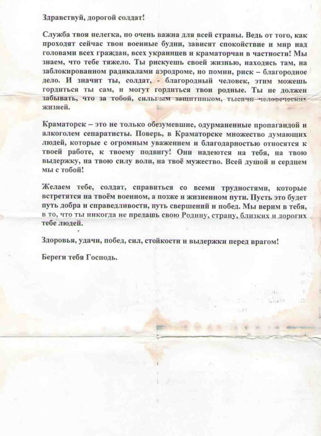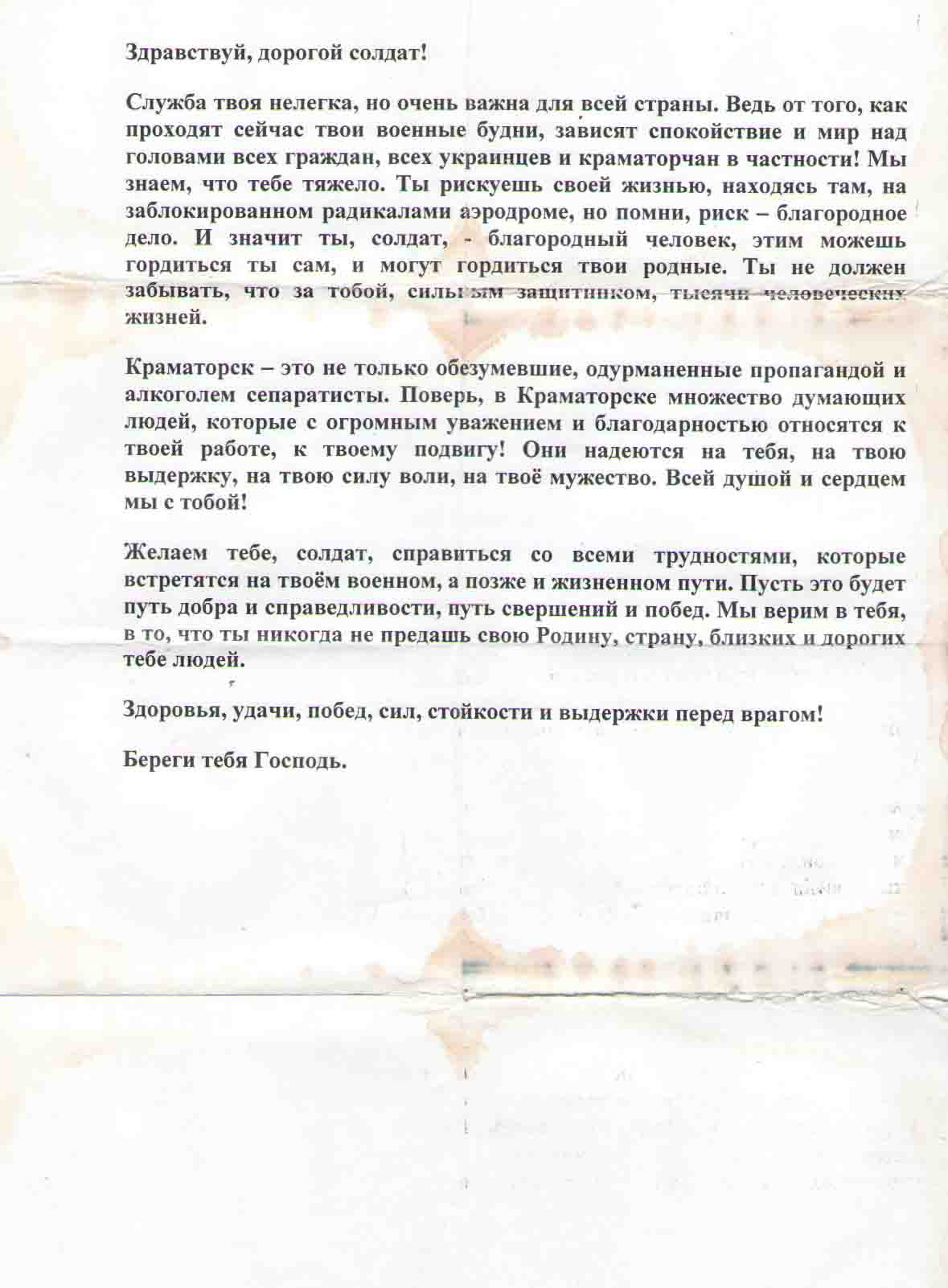 «Декілька листів на фронт, від яких, як самі призналися бійці, вони ледь стримували сльози. І лист від мешканців Краматорська, коли десантники були в кільці оточення 18 днів без іжі, без води і будь-якої підтримки. Вижили. Нажаль не всі», - розповів директор ДП «Волинські старожитності» Олексій Златогорський.