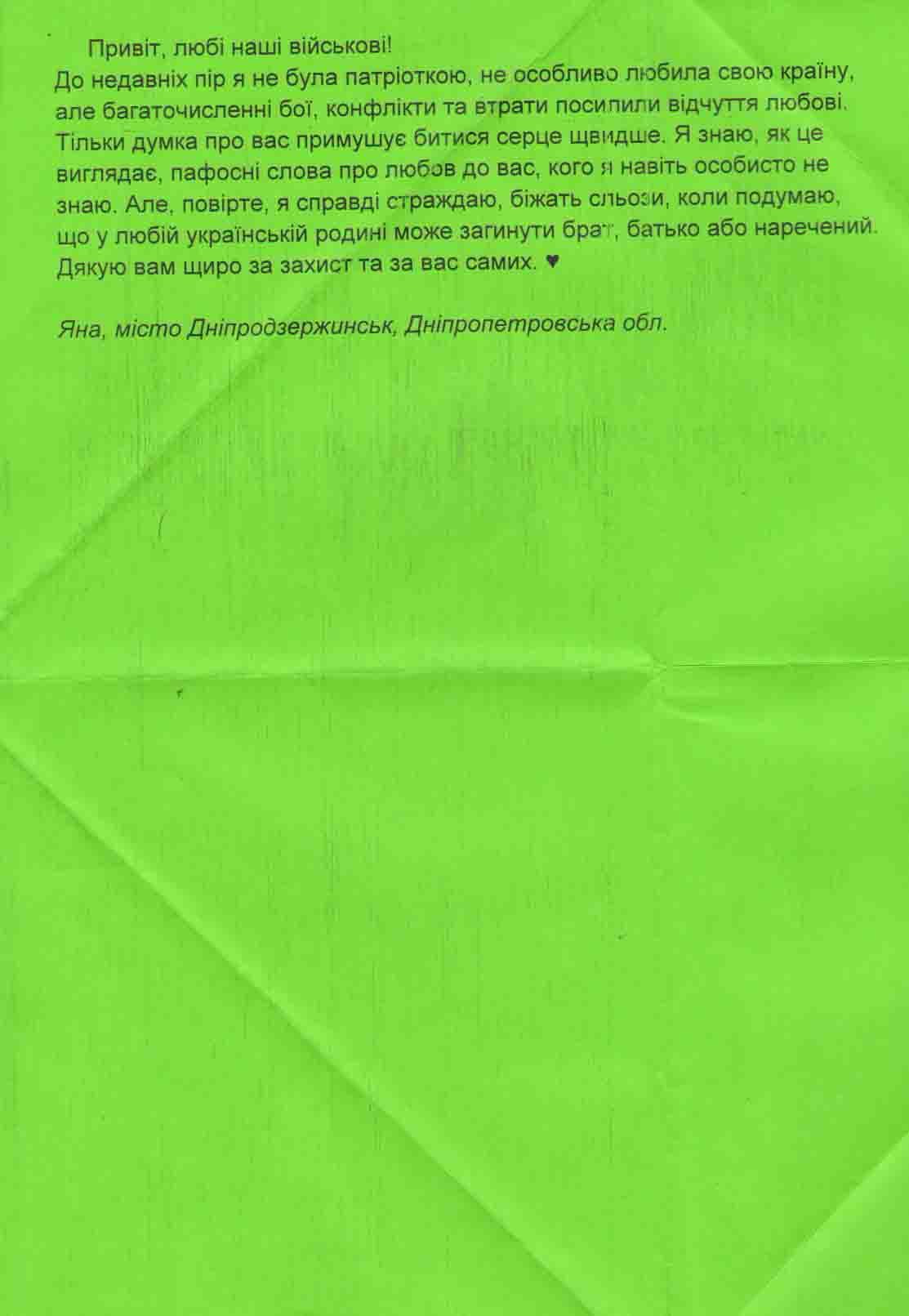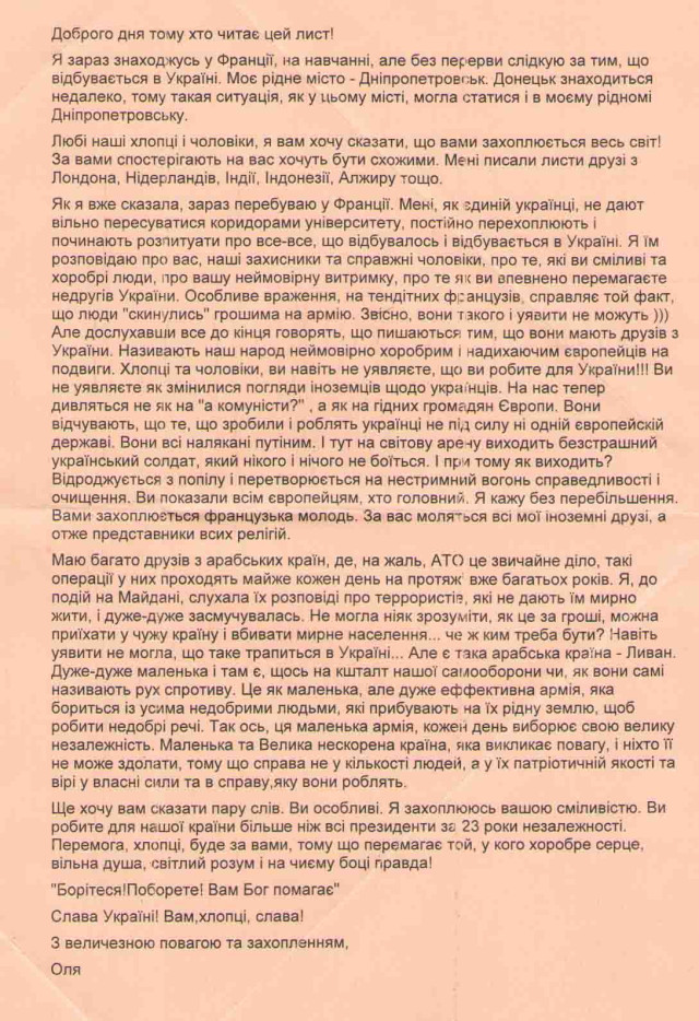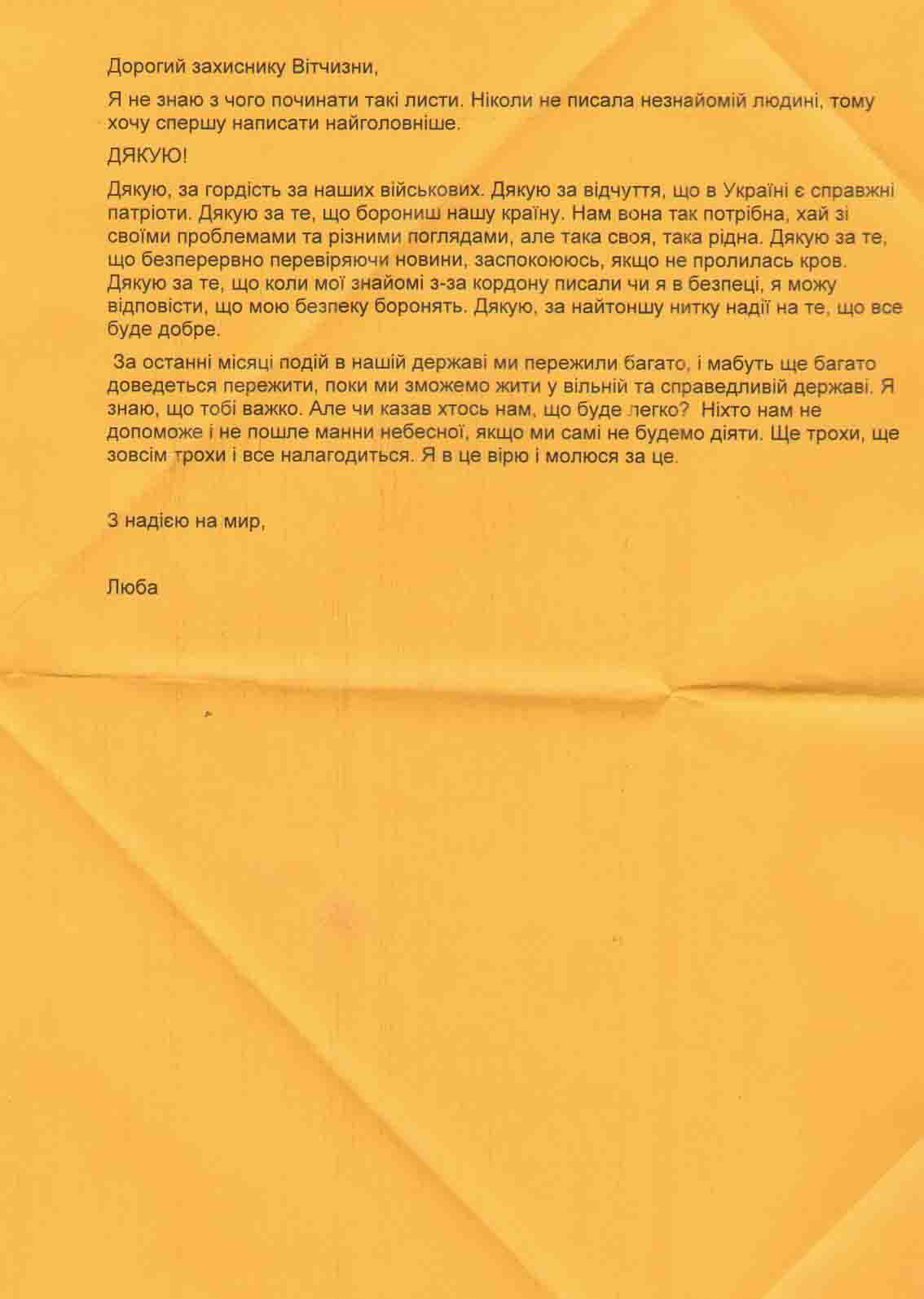 Тексти листів, написаних незнайомим солдатам, говорять самі за себе. У них - слова про народжений в серцях українців патротизм, глибока вдячність, підтримка і надія на цих хлопців, які виконують свій обов'язок - рятують Україну.